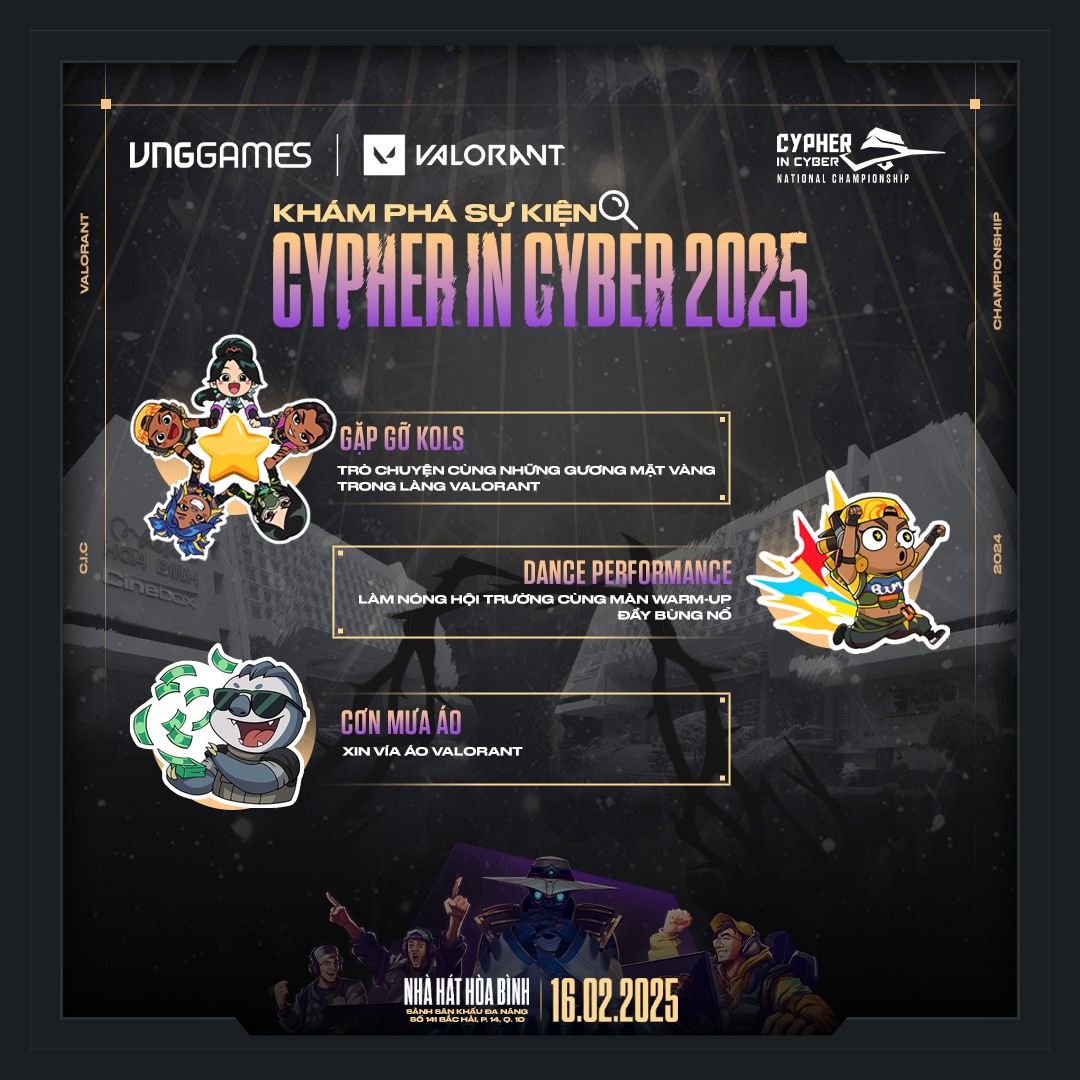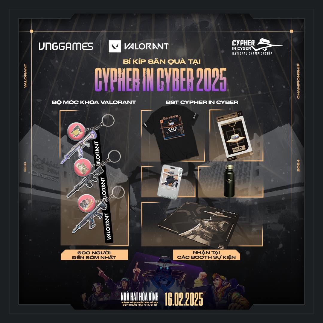 - Hoạt động kinh điển từng gây bão tại các sự kiện OFFLINE VALORANT nay đã trở lại, hứa hẹn sẽ đốt cháy sân khấu CYPHER IN CYBER 2025 với hàng loạt áo phông độc đáo của Cypher sẽ được trao cho các bạn khi tham gia