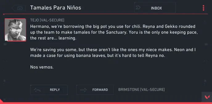 Trong thư, Tejo tiết lộ rằng anh đang “mượn tạm” chiếc nồi lớn của Brimstone để nấu tamales tại Sanctuary, cùng sự góp mặt của Reyna và Gekko. Không khí trong thư khá nhẹ nhàng, gần gũi, giống như một buổi tụ họp gia đình hơn là căn cứ của một tổ chức chiến đấu.