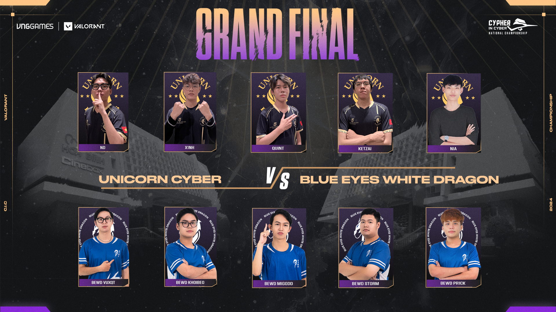 Unicorn Cyber đã chứng minh sức mạnh của mình ngay từ vòng loại, liên tục giành chiến thắng và khẳng định vị thế là một trong những ứng cử viên hàng đầu cho chức vô địch. Với đội hình gồm những thành viên tài năng và giàu kinh nghiệm, Unicorn Cyber đã thể hiện sự phối hợp ăn ý, khả năng đọc tình huống nhạy bén và kỹ năng cá nhân điêu luyện.