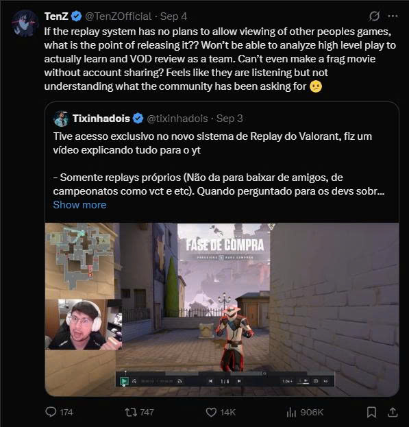 - Dù được kỳ vọng từ lâu, hệ thống Replay lại tạo nên nhiều tranh luận trong cộng đồng. Những tên tuổi lớn như TenZ hay Tixinhadois bày tỏ thất vọng khi tính năng này chỉ cho phép xem lại các trận cá nhân đã tham gia, không thể tải về trận đấu của bạn bè, pro player hay sử dụng trong VCT/custom games.