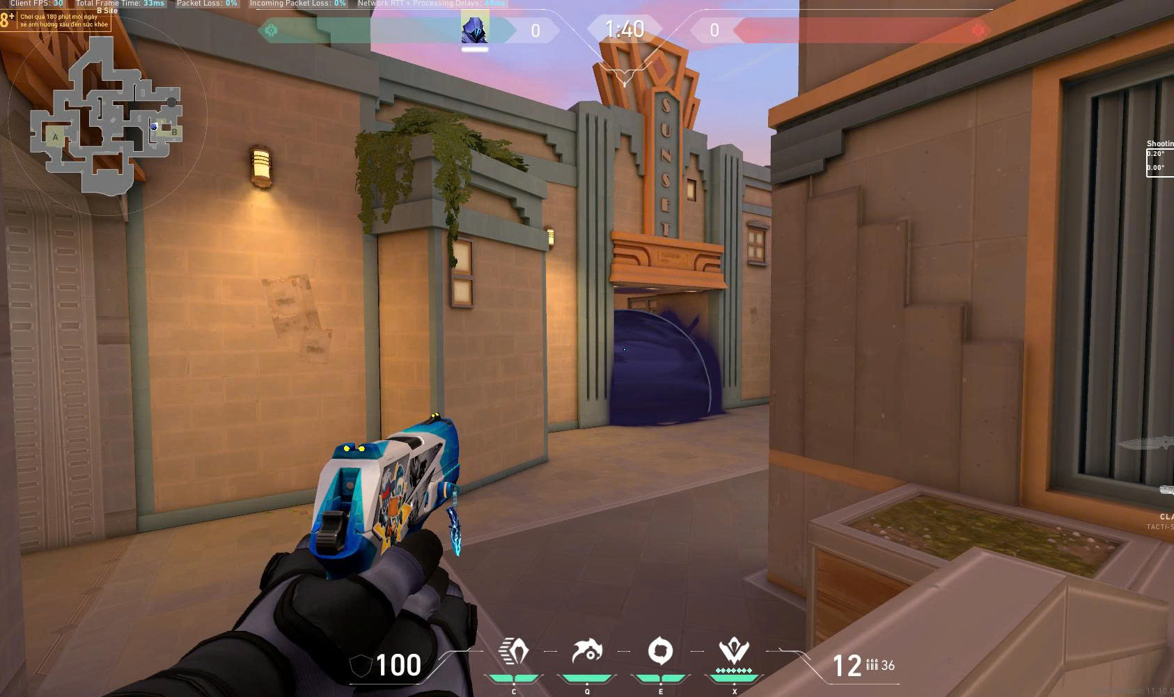 Site B của Sunset là nơi phòng thủ dễ “neo” nhờ tầm nhìn xa từ Market và góc cao tại B Boba. Omen có thể phá vỡ điều này nếu smoke chuẩn vị trí: