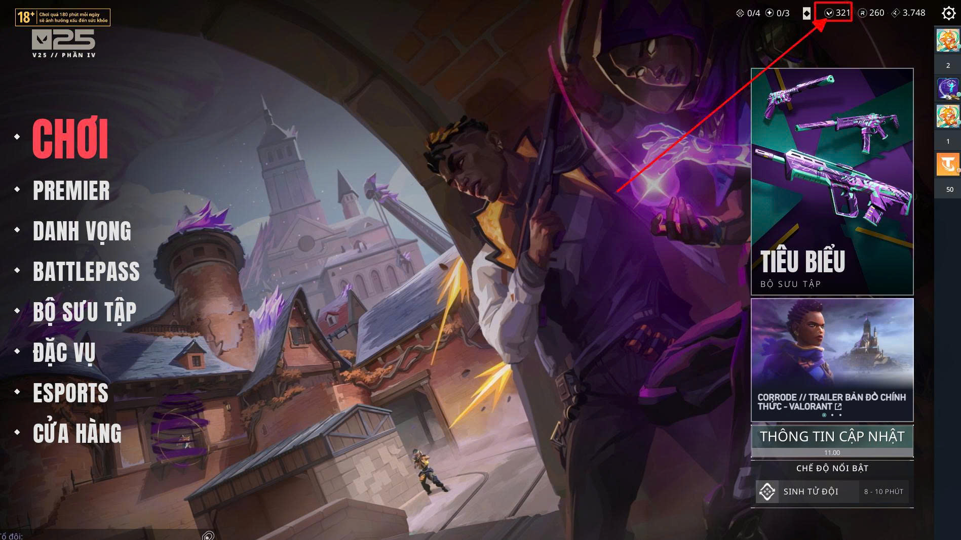 Bước 2: Tại giao diện chính, nhấn vào biểu tượng VP (VALORANT Point) ở góc trên cùng bên phải.