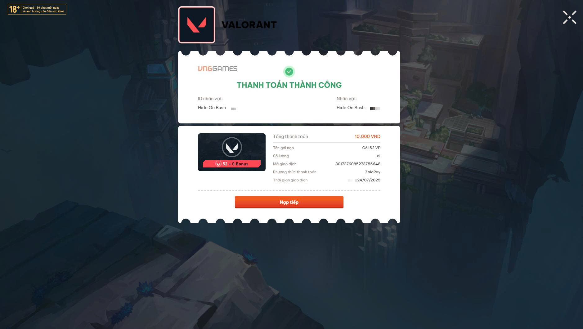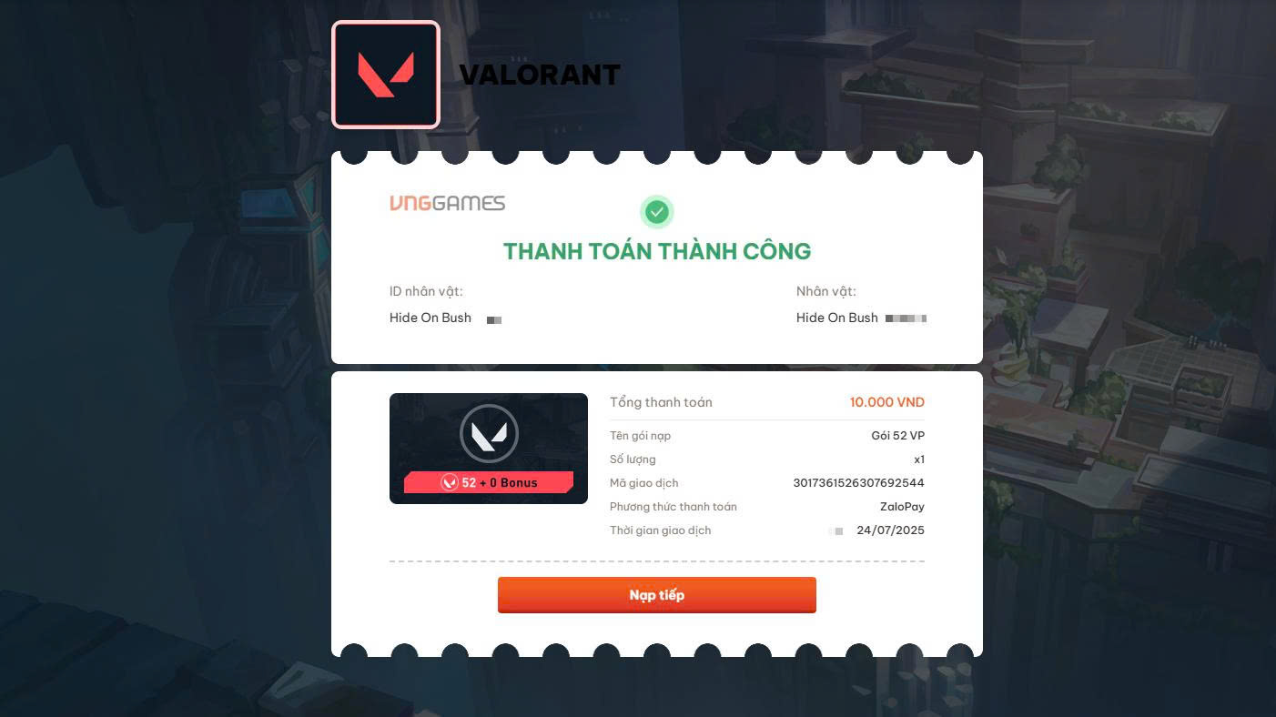 - Luôn kiểm tra giao dịch sau khi nạp. Nếu phát sinh sự cố, hãy giữ lại hóa đơn và liên hệ bộ phận hỗ trợ của Riot/VNGGames ngay lập tức.