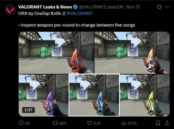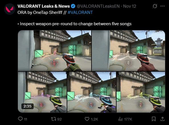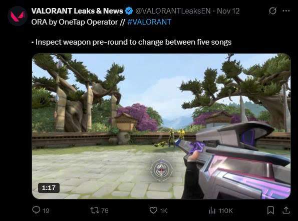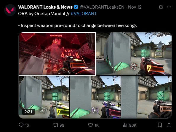 Tuyệt phẩm ORA by OneTap mang đến 5 playlist nhạc chủ đề agent gồm Iso, Phoenix, Harbor, Gekko và Chamber. Mỗi khi kiểm tra vũ khí, người chơi có thể chọn playlist riêng, thay đổi nhạc nền, hiệu ứng âm thanh khi bắn – hạ gục – và cả finisher.