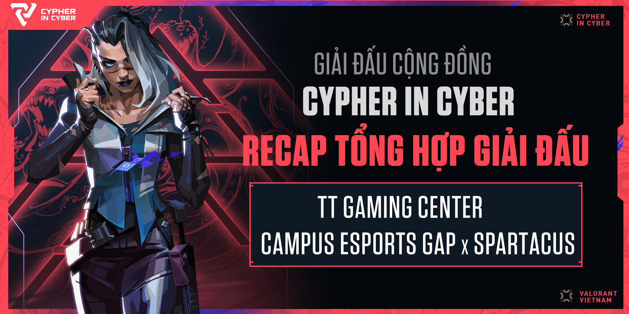 Mùa giải đầu tiên của Cypher In Cyber x TT Gaming Center đã thành công tốt đẹp bằng một ngày hỗn chiến với những pha xử lý không tưởng đến từ các game thủ trong cộng đồng VALORANT tại Hà Nội. BTC TT Gaming xin được vinh danh 4 đội tuyển xuất sắc nhất giải đấu gọi tên:
