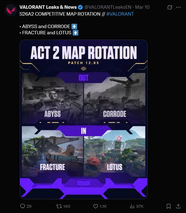 Trong bản cập nhật Act 2 sắp tới (dự kiến đi kèm patch 12.05), Riot Games sẽ đưa Fracture và Lotus trở lại danh sách bản đồ xếp hạng và thi đấu chuyên nghiệp, đồng thời loại Corrode và Abyss khỏi bể map cạnh tranh. Cả hai đều từng là những bản đồ biểu tượng, nổi tiếng với cấu trúc “dị thường”, nhiều lối vào site và nhịp độ trận đấu nhanh, khiến việc kiểm soát không gian và set-play trở nên đặc biệt quan trọng.