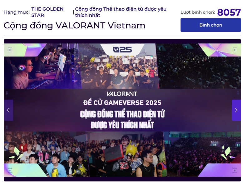 Cộng đồng VALORANT những ngày qua rất sôi động tại Gameverse , khi những lá phiếu nhiệt thành được gửi gắm, tựa như những lời yêu thương chân thành dành cho hai hạng mục sáng giá của VALORANT là: Cộng Đồng Thể Thao Được Yêu Thích Nhất & Game Thể Thao Điện Tử Xuất Sắc Nhất. Mỗi lượt bình chọn không đơn thuần là một dấu tick, ẩn chứa trong đó niềm tin, sự trân trọng và cả khát vọng về một tương lai rạng rỡ hơn nữa cho cộng đồng VALORANT Việt Nam. Chính tình cảm nồng ấm ấy là ngọn lửa tiếp thêm sức mạnh, để cộng đồng VALORANT Việt Nam thêm vững vàng trên hành trình chinh phục những đỉnh cao mới, khẳng định vị thế đầy tự hào trong thế giới game FPS đỉnh cao.
