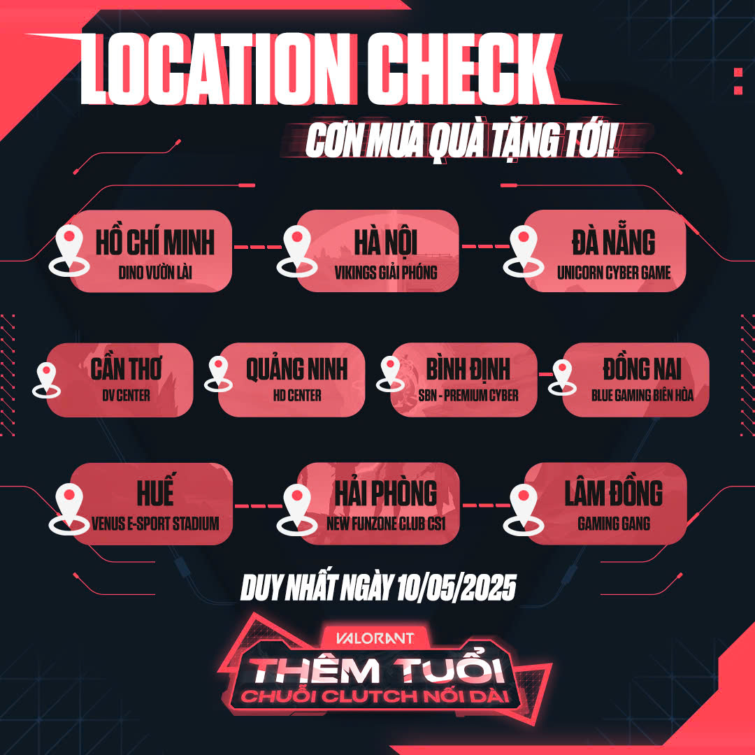 Chào mừng Sinh nhật 5 năm VALORANT Việt Nam, chúng ta tiếp tục với sự kiện check-in tại 10 phòng máy trên toàn quốc, cơ hội tuyệt vời để các fan VALORANT có thể mang về những phần quà giá trị và giới hạn.