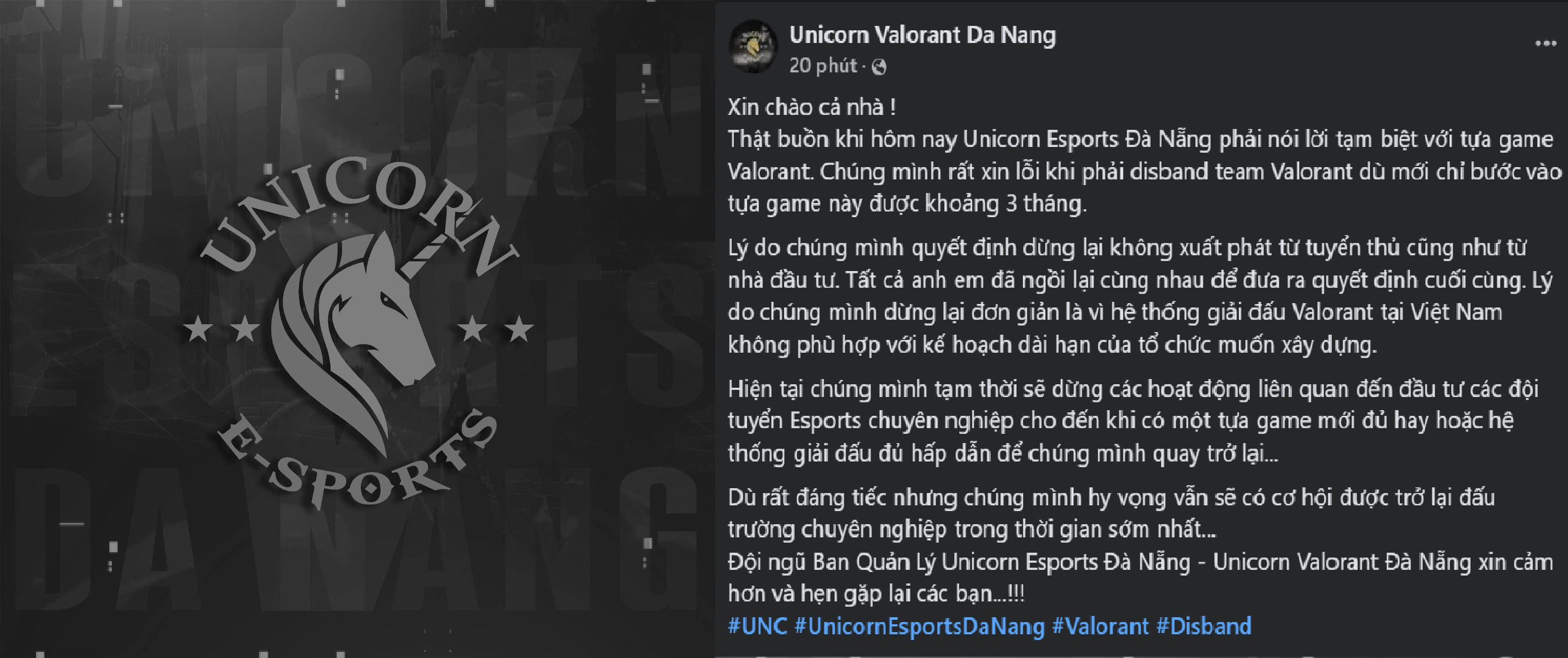 Unicorn Esports tại khu vực Đà Nẵng bất ngờ giải tán đội hình VALORANT.