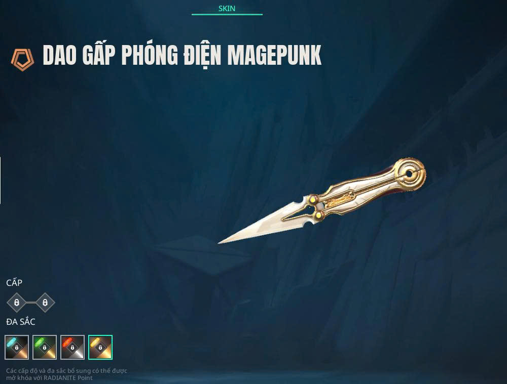 Dao gấp phóng điện magepunk mang đậm hơi thở steampunk cổ điển, kết hợp cùng các hiệu ứng điện năng hiện đại đặc trưng của dòng Magepunk. Mỗi lần rút dao hay vung đòn, luồng điện chạy dọc theo lưỡi dao, ở các cấp nâng cấp cao, hiệu ứng điện được duy trì liên tục, khiến cây dao trông sống động hơn bao giờ hết.