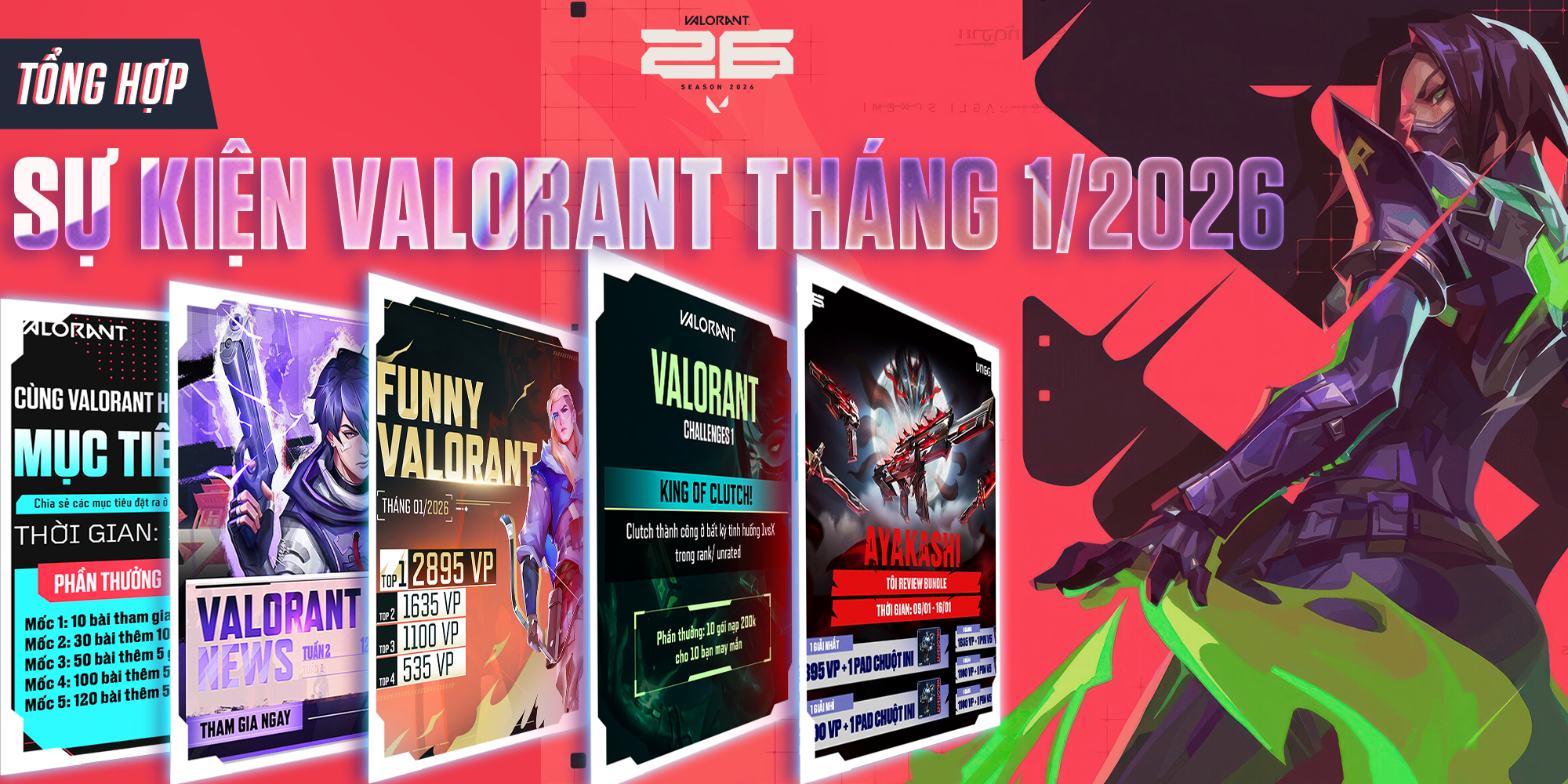 Tháng 1/2026 đánh dấu chuỗi sự kiện sôi động của VALORANT, nơi mọi game thủ đều có cơ hội nhận VP, vật phẩm ingame và nhiều phần quà giá trị thông qua các hình thức tham gia đơn giản, dễ tiếp cận.