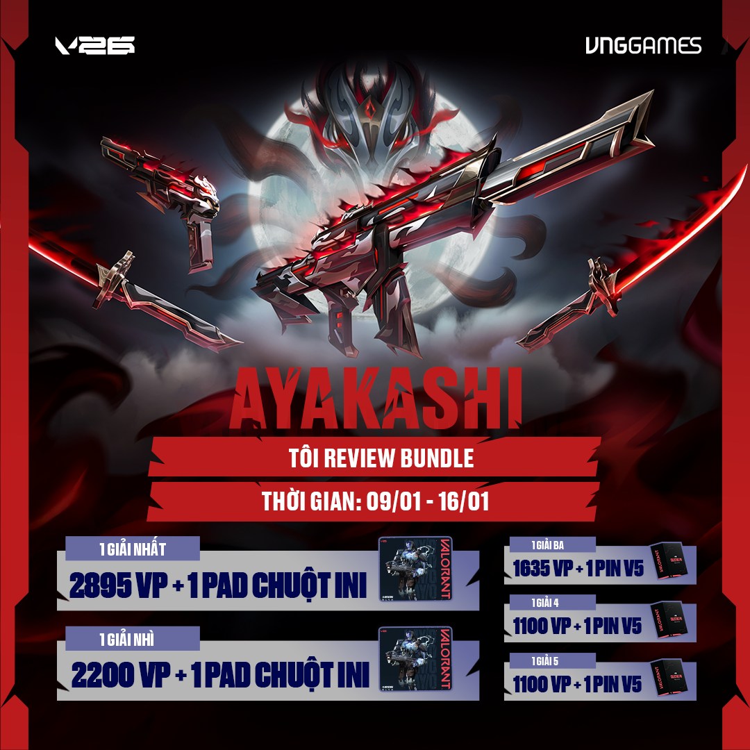 Nếu bạn là người yêu thích skin súng VALORANT, đừng bỏ lỡ cơ hội chia sẻ cảm nhận về bundle Ayakashi: từ thiết kế, hiệu ứng cho đến mức độ “đáng tiền”. Review càng chi tiết, góc nhìn càng độc đáo - cơ hội chạm tay phần thưởng càng cao!