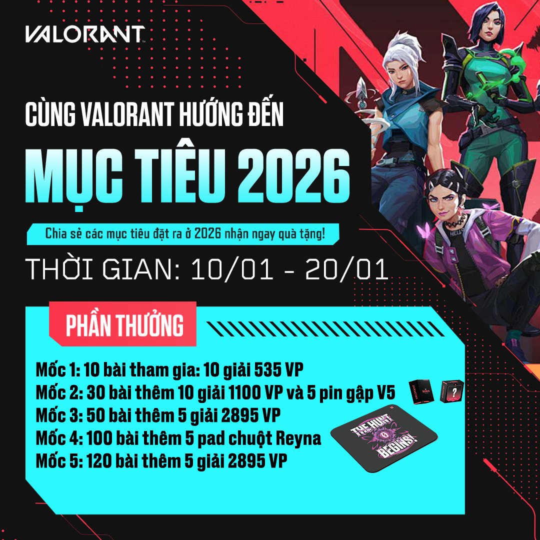 Càng nhiều người tham gia, quy mô giải thưởng càng được mở rộng. Hãy rủ bạn bè và đồng đội cùng chia sẻ mục tiêu năm mới, để cộng đồng VALORANT cùng nhau bứt phá trong năm 2026!