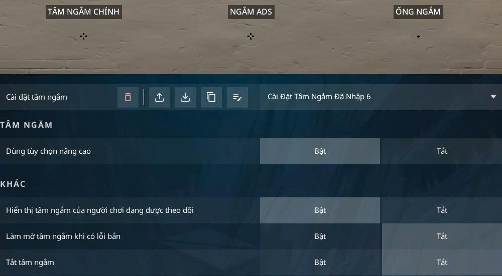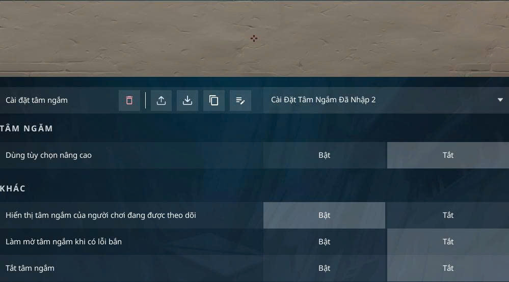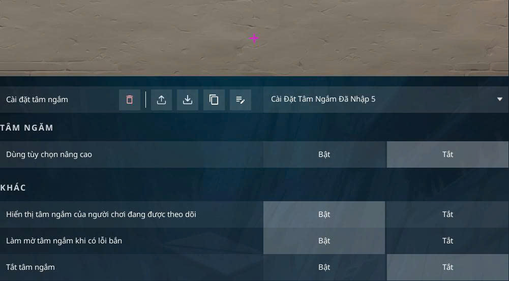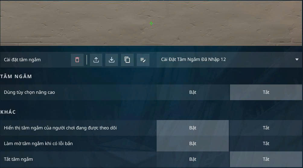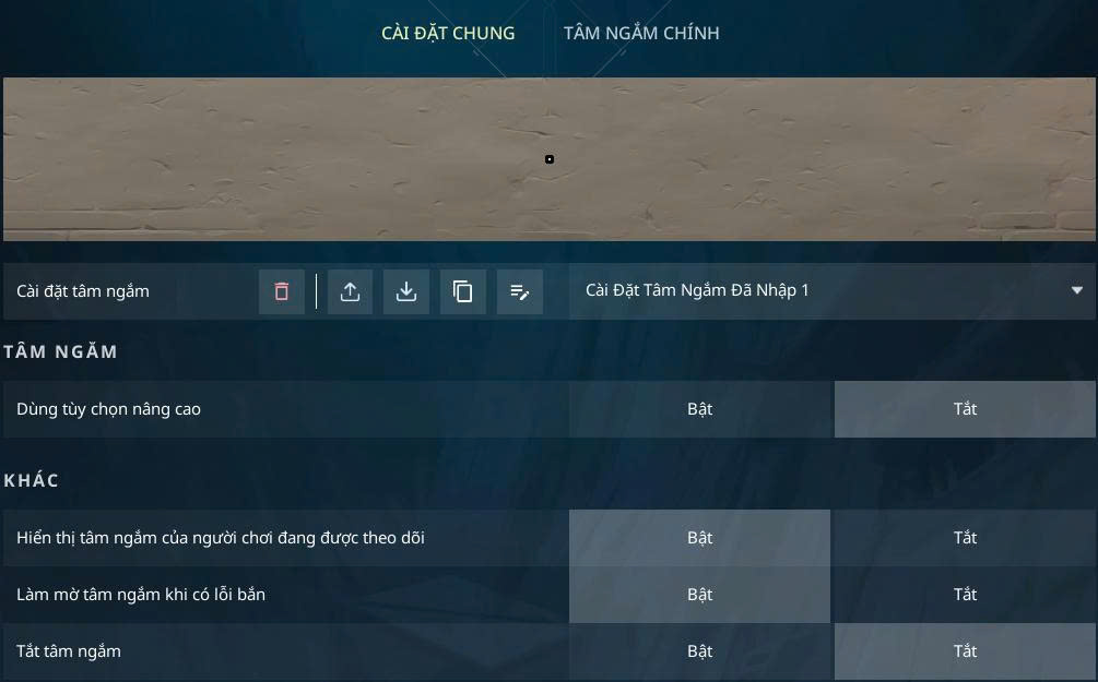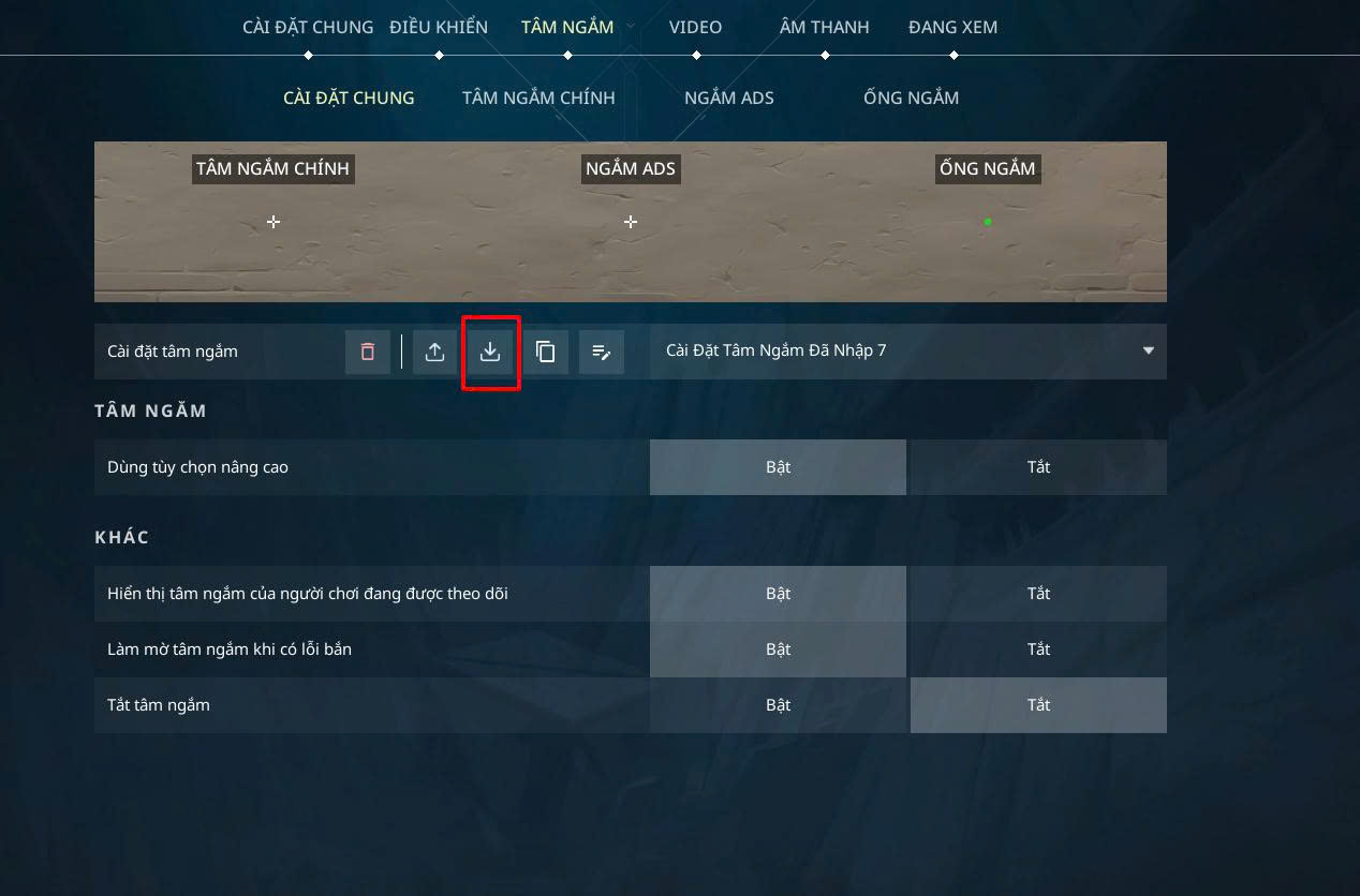- Vào game → Cài đặt → Tâm ngắm (Crosshair).