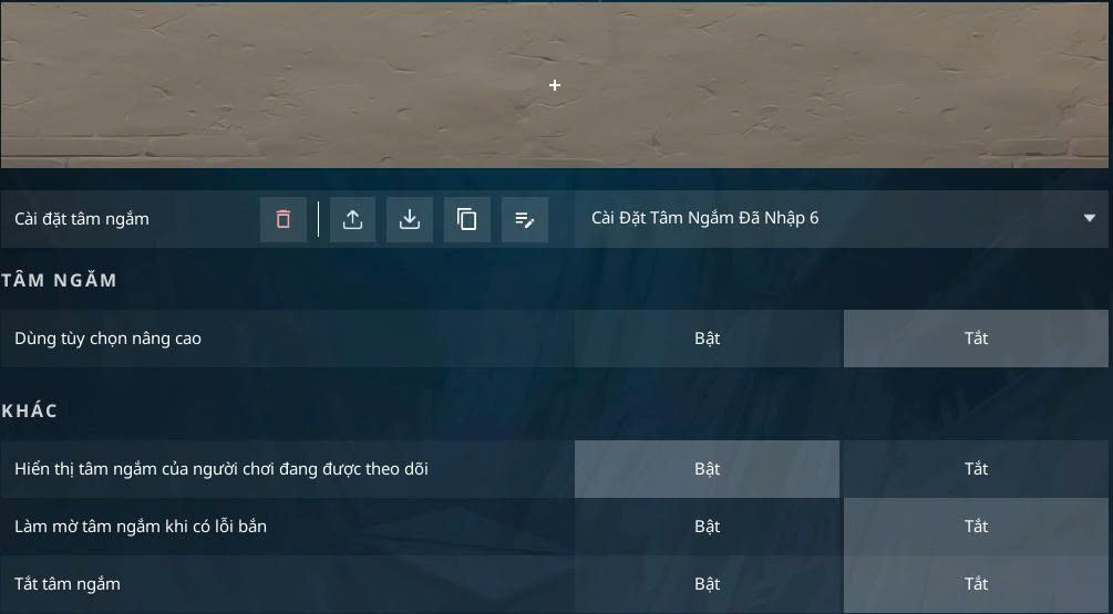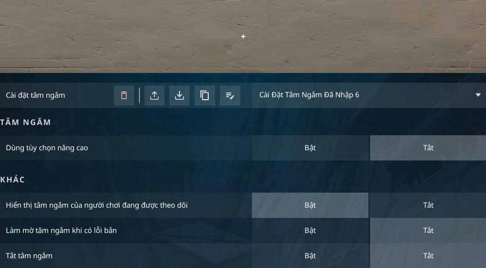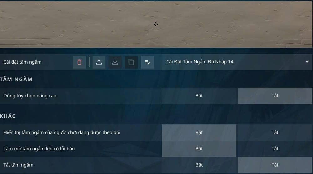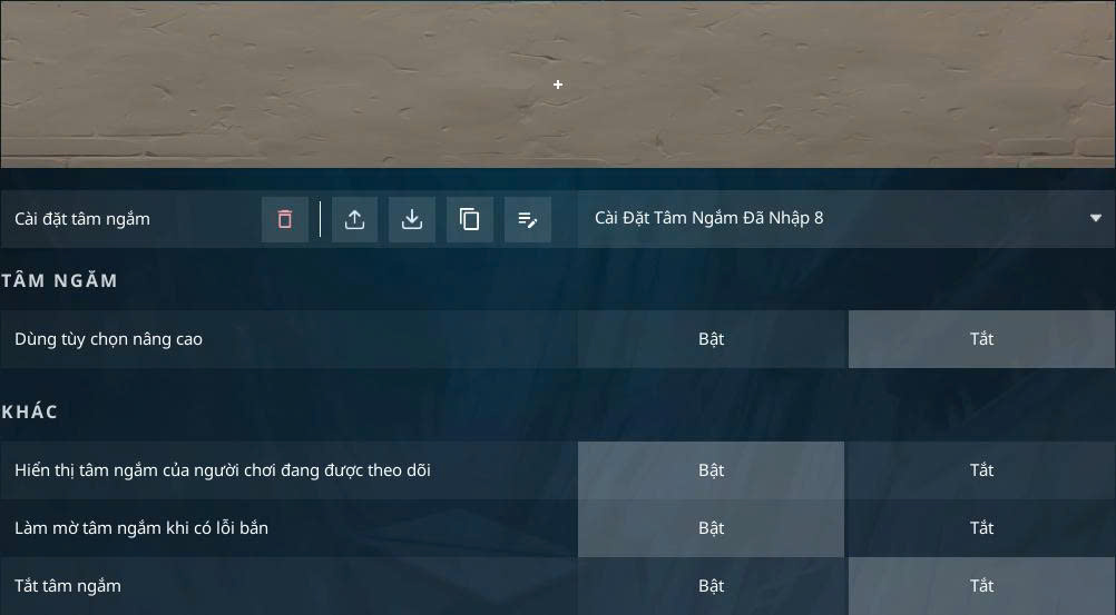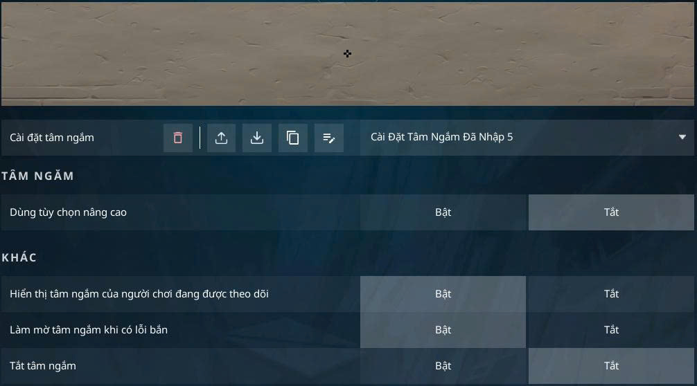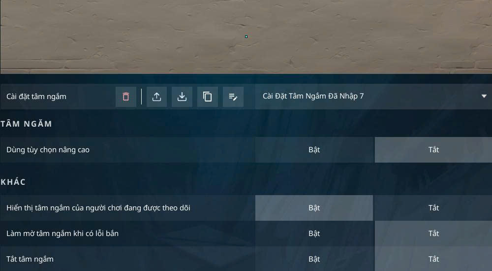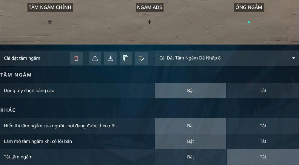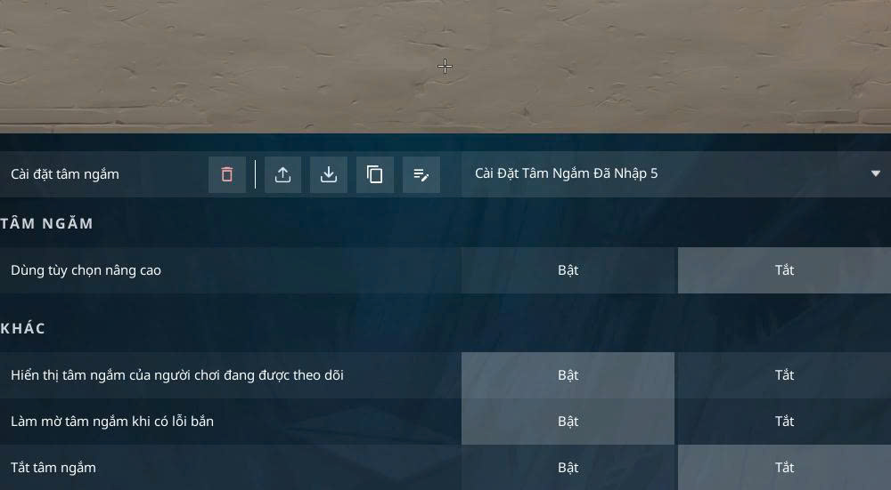 - Vào game → Cài đặt → Tâm ngắm (Crosshair).
