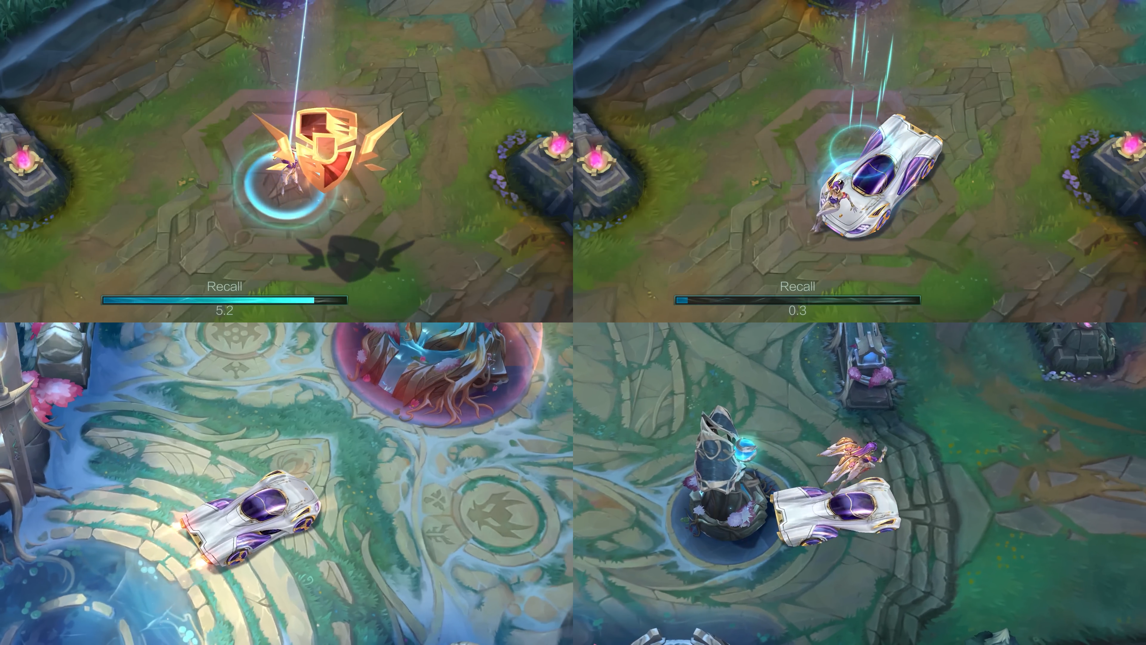 Đây là một trong những điểm nhấn nổi bật nhất của trang phục. Thay vì di chuyển thông thường, Kai’Sa xuất hiện bên cạnh một mẫu siêu xe Porsche với thiết kế trắng bạc sang trọng. Hoạt ảnh cô bước ra hoặc lướt đi cùng xe mang đậm chất điện ảnh, tạo cảm giác chỉn chu và cao cấp ngay từ những khoảnh khắc đầu trận.