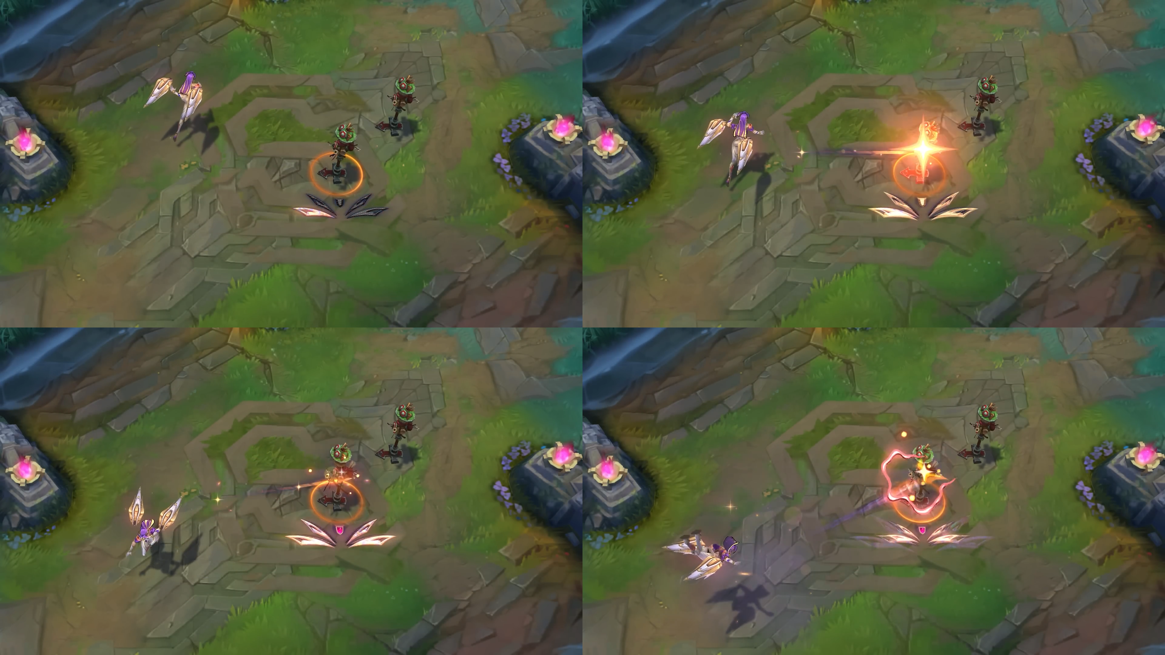 Kai’Sa phóng ra một luồng năng lượng tầm xa với hiệu ứng vệt sáng kéo dài mượt mà. Nhiều game thủ nhận xét hiệu ứng này có nét tương đồng với dòng Vệ Binh nhưng được tinh chỉnh để trông hiện đại và "công nghệ" hơn.