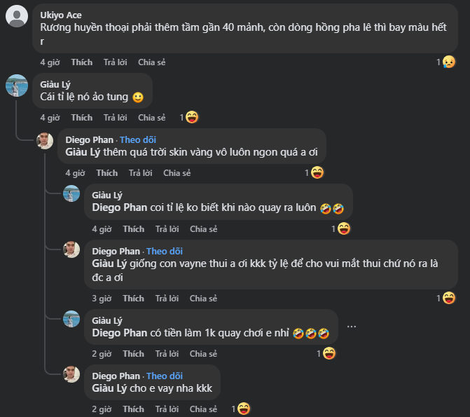 - "3 cái rương Cam và 5 rương tím đợt miêu quan năm ngoái thấy skin cũ mèm chờ update nên xài hết rồi. Giờ tiếc hùn hụt!"