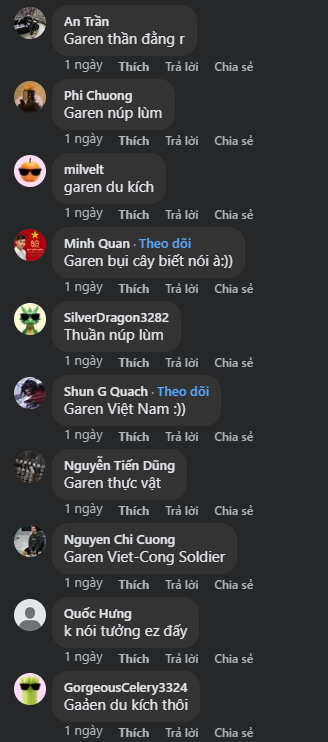 Lối chơi núp bụi vốn đã gắn liền với Garen trong suốt nhiều năm, và lần này Riot dường như đã “hiện thực hóa” điều đó bằng thiết kế trang phục. Cộng đồng nhanh chóng hưởng ứng với loạt bình luận quen thuộc: