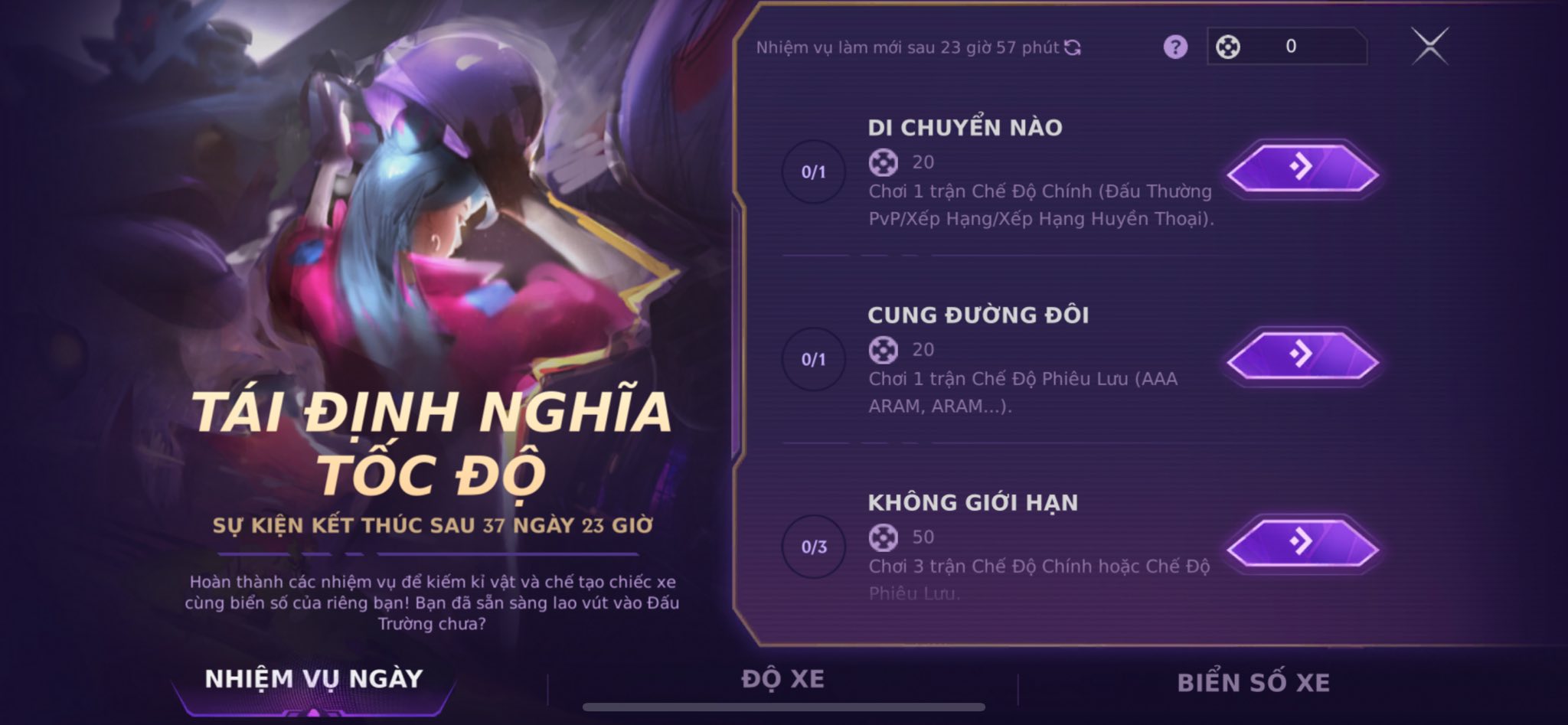 - Di Chuyển Nào: Chơi 1 trận chế độ chính (Đấu Thường, Xếp Hạng…).
