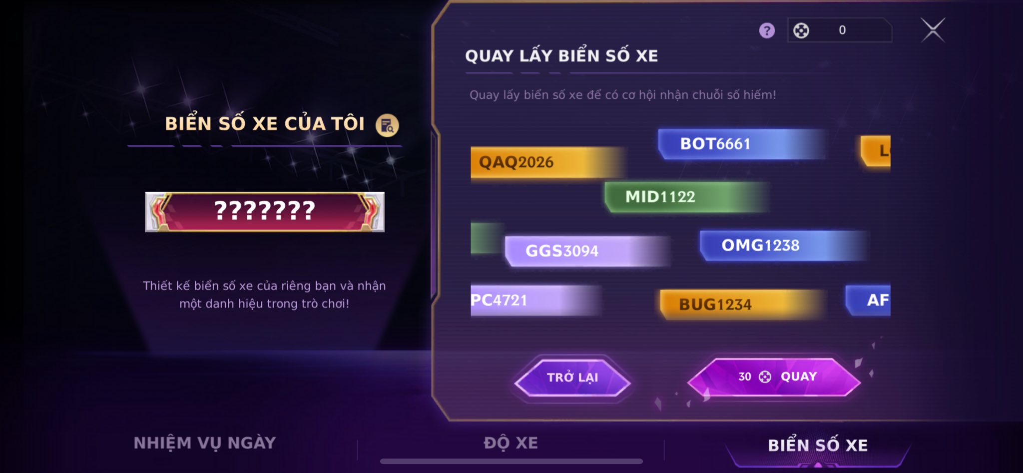 Đây là điểm nhấn thú vị nhất của sự kiện. Người chơi sẽ lựa chọn nền biển số với nhiều màu sắc như hồng, cam, đen, xanh… Sau đó tiến hành quay số ngẫu nhiên để nhận dãy ký tự hoặc số đặc biệt, có thể là hiếm hoặc độc quyền.