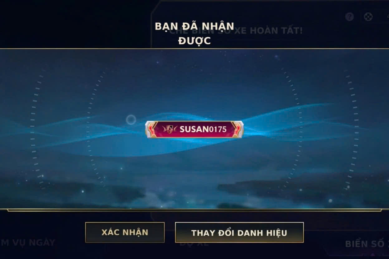 - Danh hiệu giới hạn (2 tháng): Hiển thị trực tiếp trên biển số xe đã chế tạo (ví dụ: SUSAN0175).