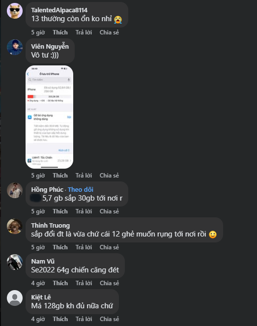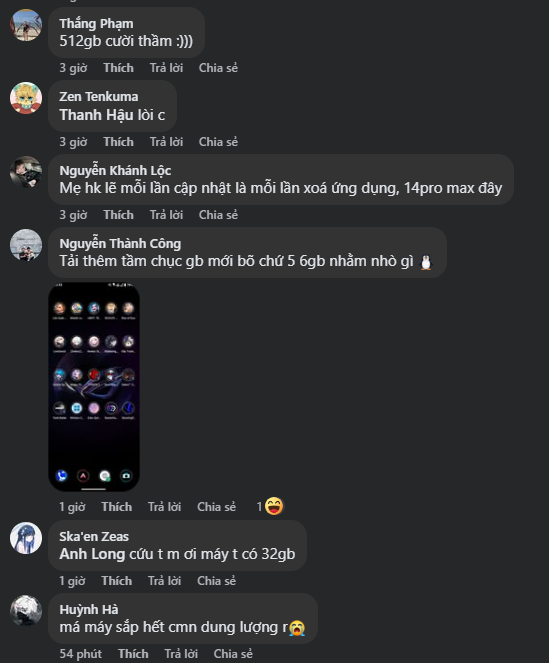 - "Máy 128GB không đủ nữa chứ, hổng lẽ mỗi lần cập nhật là mỗi lần xoá ứng dụng? 14 Pro Max đây."