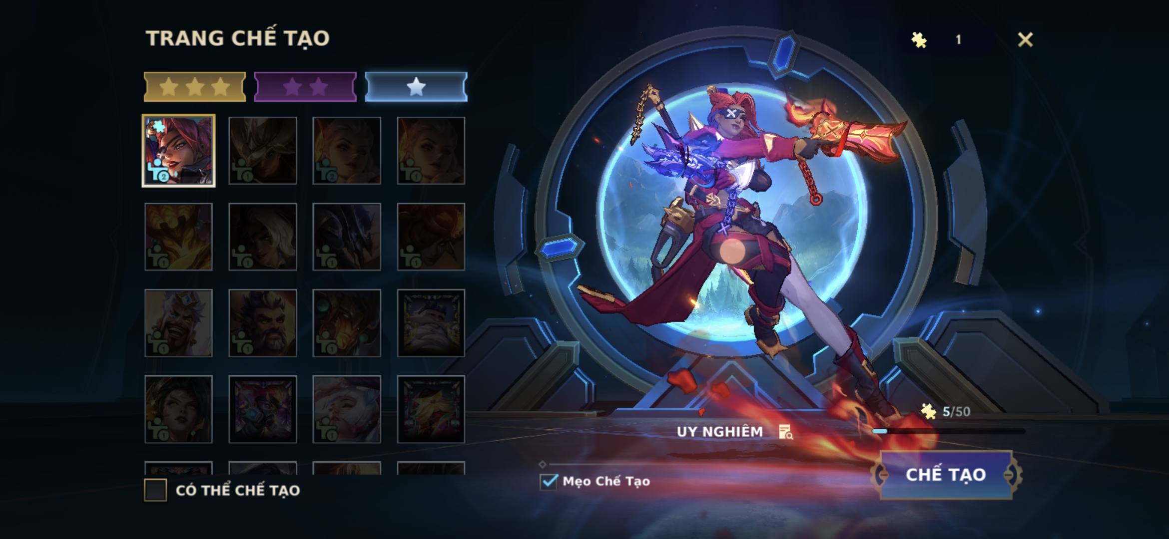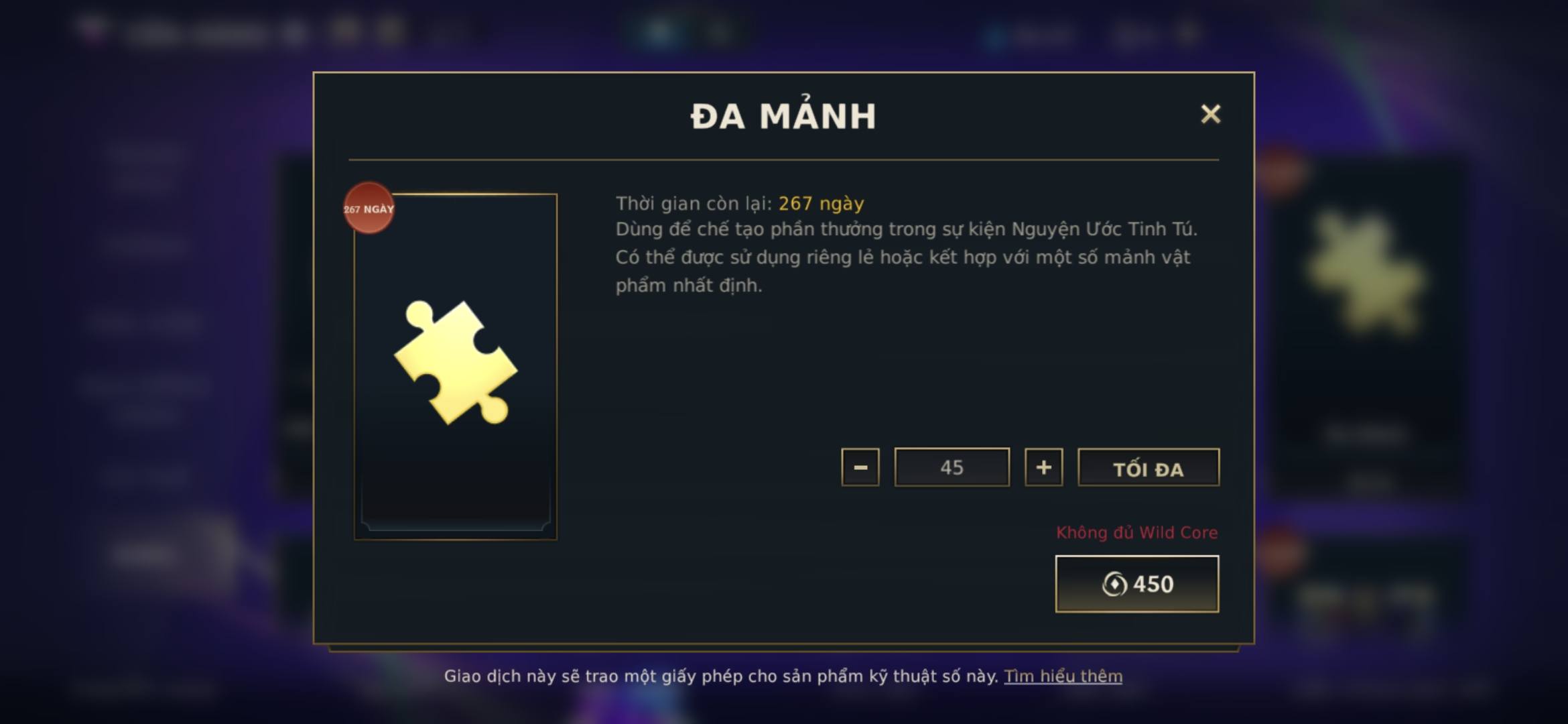 Ví dụ: Để đổi tư thế Samira cần 50 mảnh, bạn đã có 5 Đơn Mảnh, chỉ cần thêm 45 Đa Mảnh để hoàn tất.