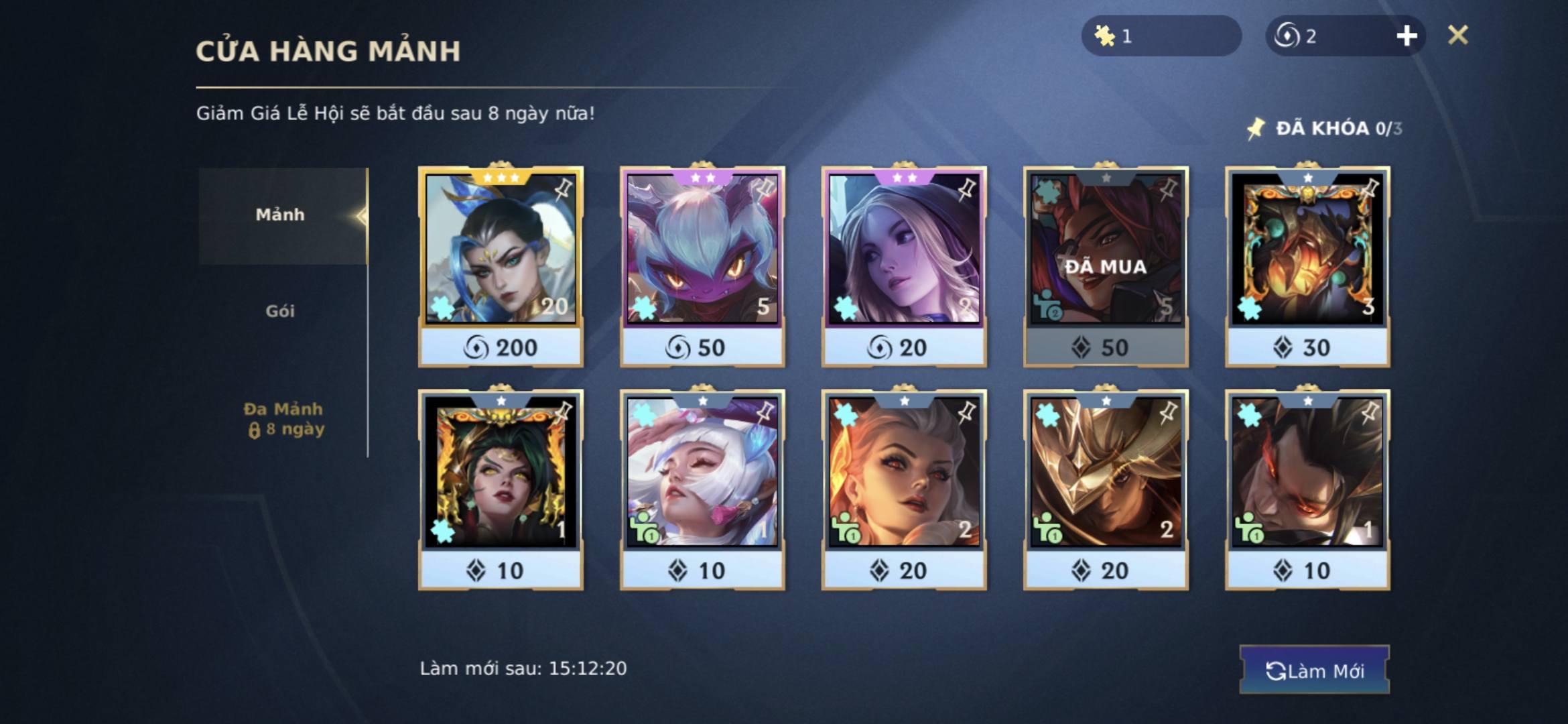 Mẹo: Sử dụng Tinh Hoa Lam để làm mới cửa hàng đến khi xuất hiện đúng loại mảnh cần thiết, sau đó mới dùng WC để mua.