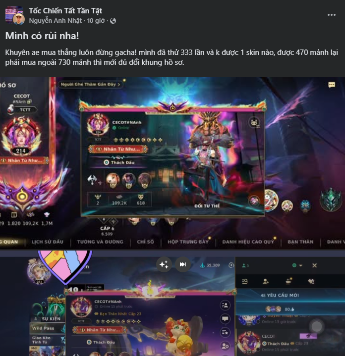 Thực tế cho thấy: Một người chơi quay ~333 lần (gần 20.000 WC) vẫn có thể không nhận được skin trực tiếp, mà chỉ tích lũy khoảng 470 mảnh. Trong khi đó, nếu dùng số WC này để mua mảnh trong cửa hàng, bạn có thể chủ động hoàn thành vật phẩm mong muốn.