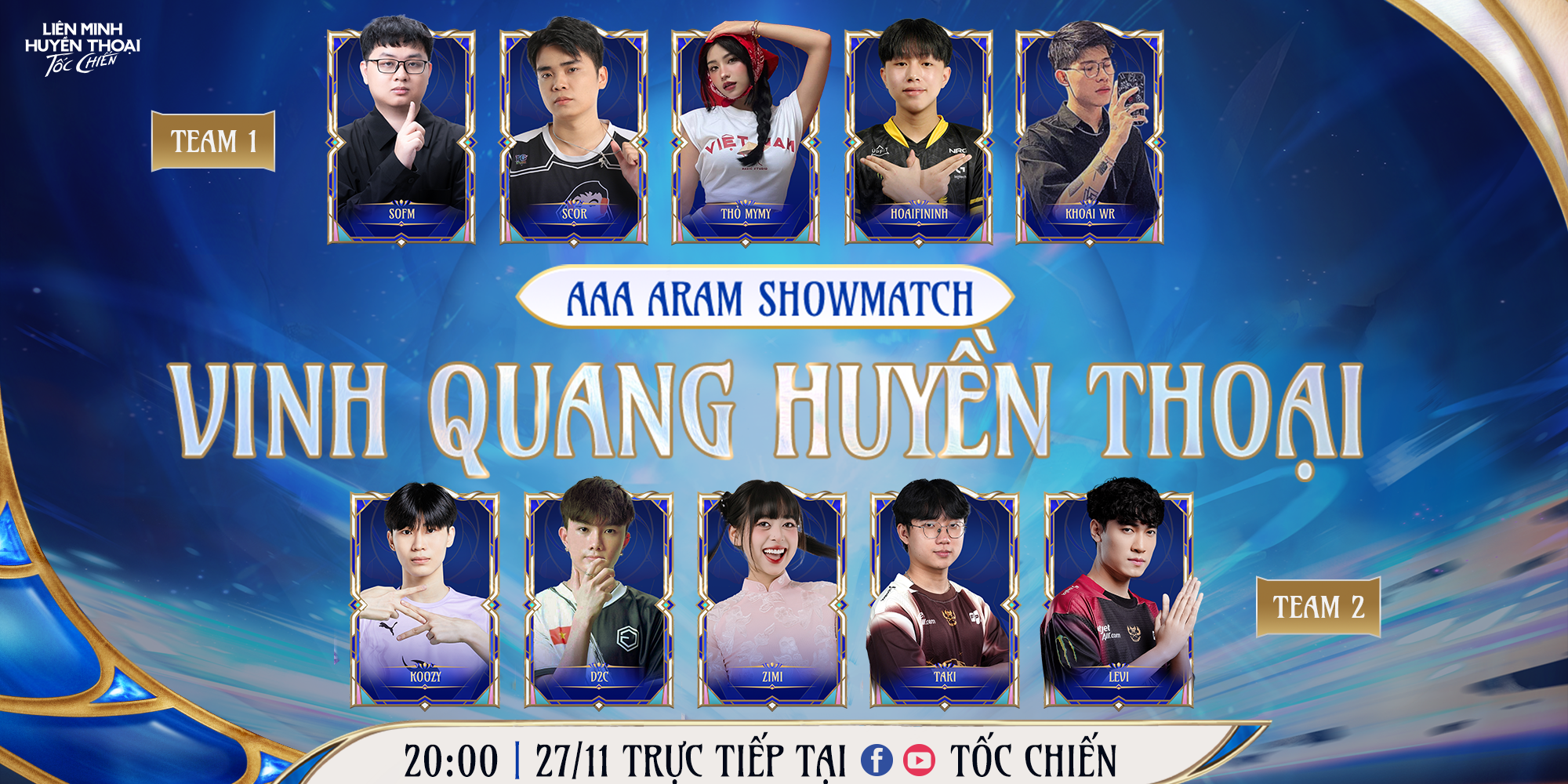 Hai đội hình quy tụ dàn tên tuổi quen thuộc của cộng đồng Tốc Chiến, trong đó tâm điểm chính là màn đối đầu giữa SofM và Levi trong cùng một trận ARAM đặc biệt. Từ kỹ năng cá nhân, khả năng đọc tình huống đến những pha phối hợp mang đậm dấu ấn từng tuyển thủ, tất cả hứa hẹn sẽ tạo nên một trận showmatch giàu cảm xúc và đáng chờ đợi.