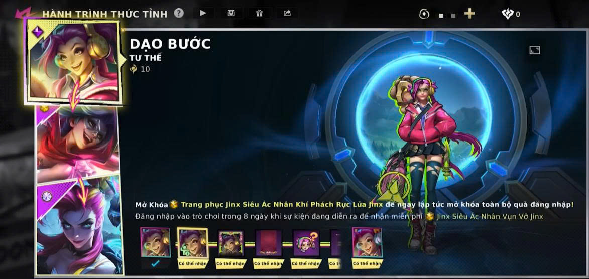 Khi người chơi hoàn thành tất cả mốc sự kiện và đạt 10.000 Điểm Thức Tỉnh, gần như toàn bộ hiệu ứng độc quyền của Jinx Siêu Ác Nhân sẽ được mở khóa.