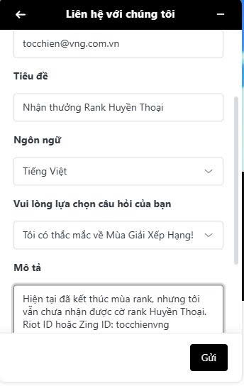 - Mô tả rõ tình trạng: ví dụ “Tôi đã đạt rank Huyền Thoại vào cuối mùa giải trước nhưng đến hiện tại vẫn chưa nhận được phần thưởng tương ứng như cờ hay khung.”