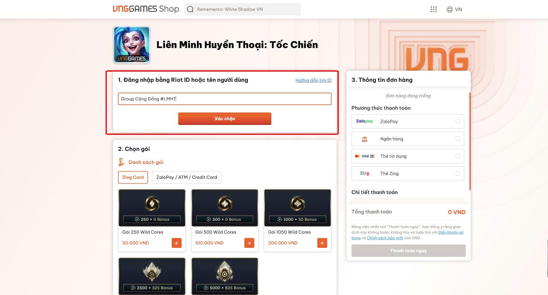 Bước 1: Truy cập trang nạp chính thức của Tốc Chiến tại: https://shop.vnggames.com/vn/game/tocchien.