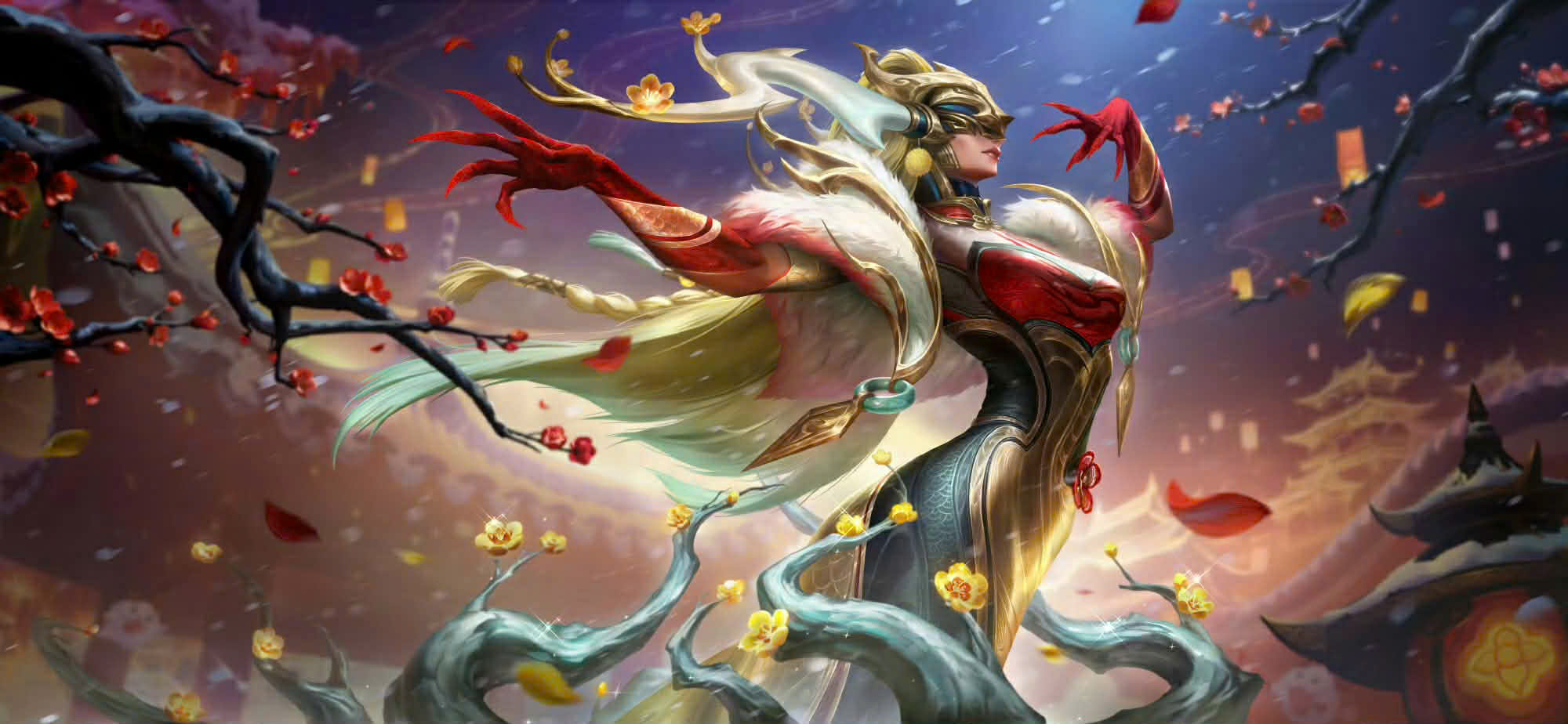 Vẻ lạnh lùng đặc trưng của Lissandra được làm mềm khéo léo bằng bảng màu xuân tinh tế. Sự hòa quyện giữa tuyết trắng và hoa mai trong hiệu ứng kỹ năng tạo nên hình ảnh một vị tướng vừa quyền uy, sắc lạnh, vừa thanh khiết và trang nhã, nổi bật giữa không khí lễ hội đầu năm.