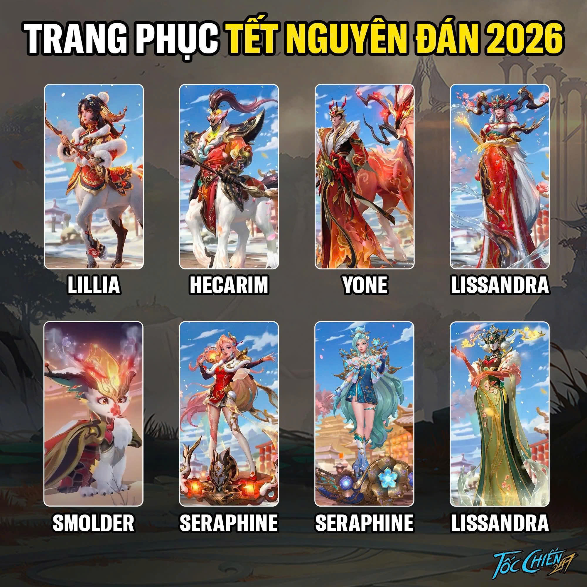 Theo một số nguồn tin đến từ Trung Quốc, đây nhiều khả năng sẽ là dòng skin Tết quy mô lớn, tiếp nối truyền thống “Lễ Hội Phương Đông” quen thuộc của Riot Games. Bộ sưu tập được cho là mang đậm phong cách cổ trang kết hợp yếu tố thần thoại, sử dụng bảng màu đỏ – vàng – xanh ngọc làm chủ đạo, cùng các họa tiết mai, đào và tuyết xuân, những biểu trưng cho khởi đầu mới, may mắn và thịnh vượng trong năm mới.