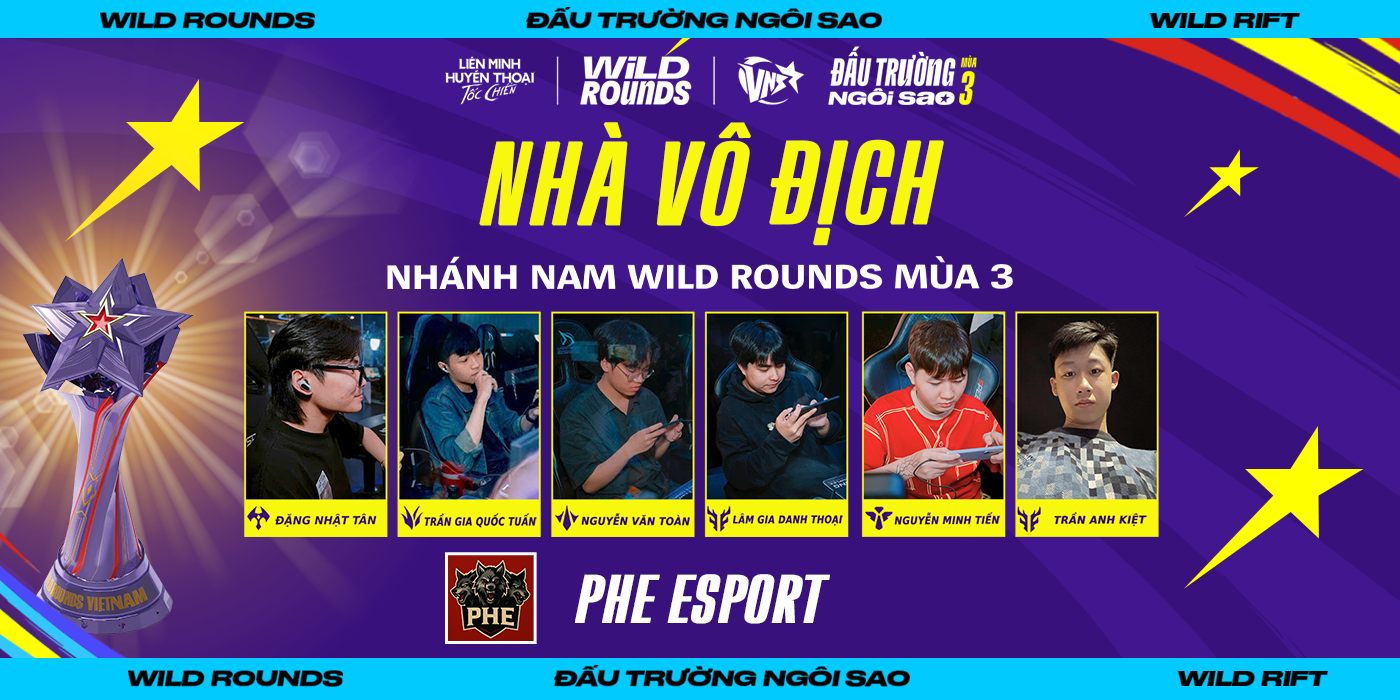 Sau hành trình tranh tài gay cấn và đầy kịch tính, đội tuyển PHE Esport đã chính thức đăng quang ngôi vô địch nhánh Nam cộng đồng tại Wild Rounds: Đấu Trường Ngôi Sao mùa 3 – giải đấu quy mô toàn quốc do Tốc Chiến Việt Nam tổ chức, nhằm tạo sân chơi chuyên nghiệp và tăng cường sự gắn kết trong cộng đồng game thủ.