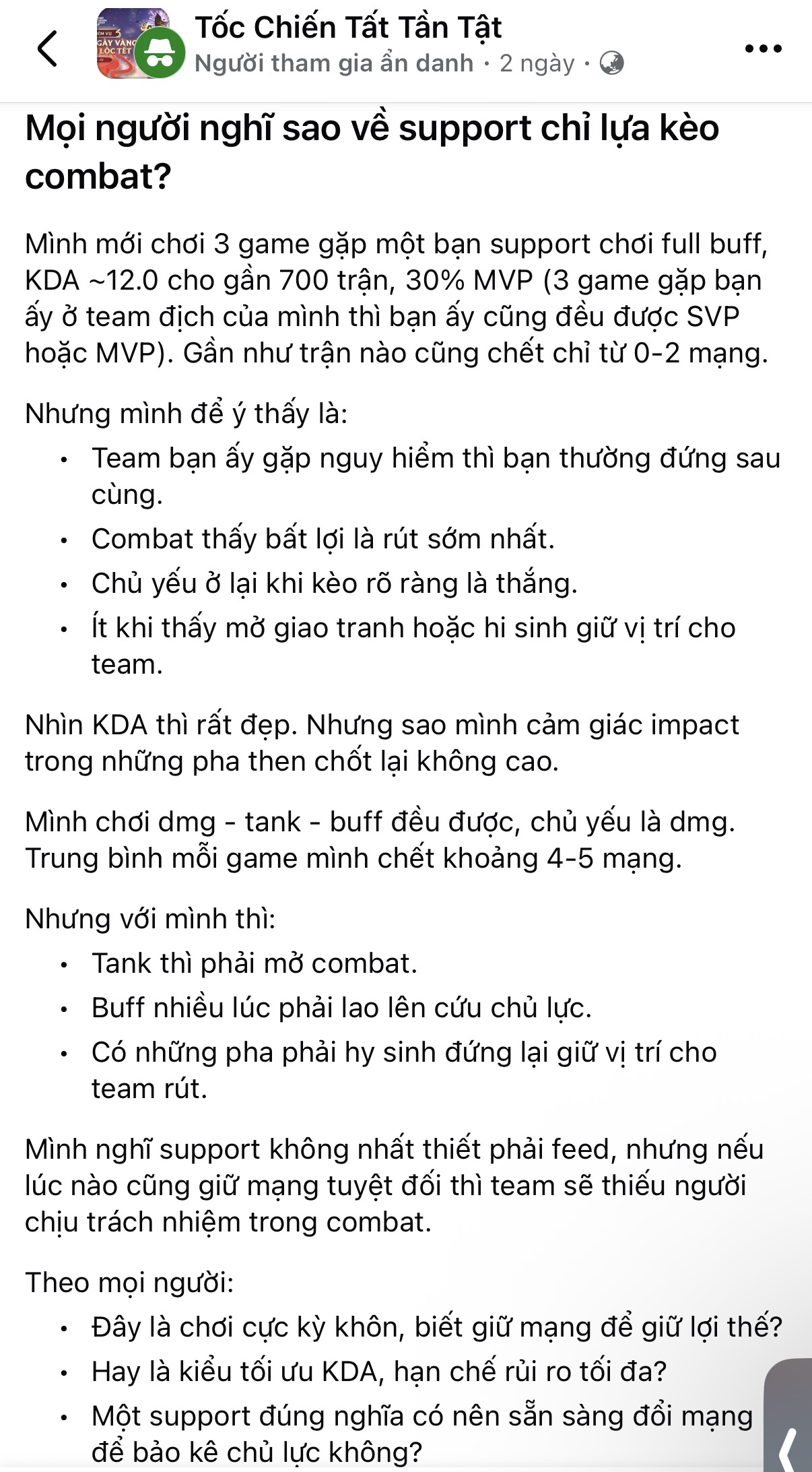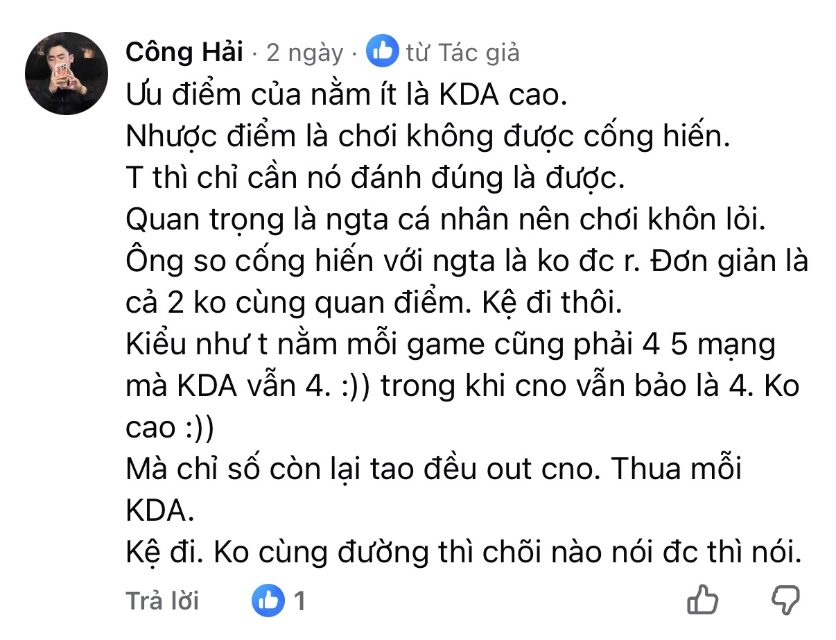 Còn bạn thì sao? Bạn chọn một Support KDA 12.0 luôn giữ vị trí an toàn, hay một Support KDA 2.0 sẵn sàng hy sinh để bảo vệ đội hình? Hãy để lại bình luận và chia sẻ góc nhìn của bạn bởi cuộc tranh luận này chắc chắn vẫn chưa có hồi kết.