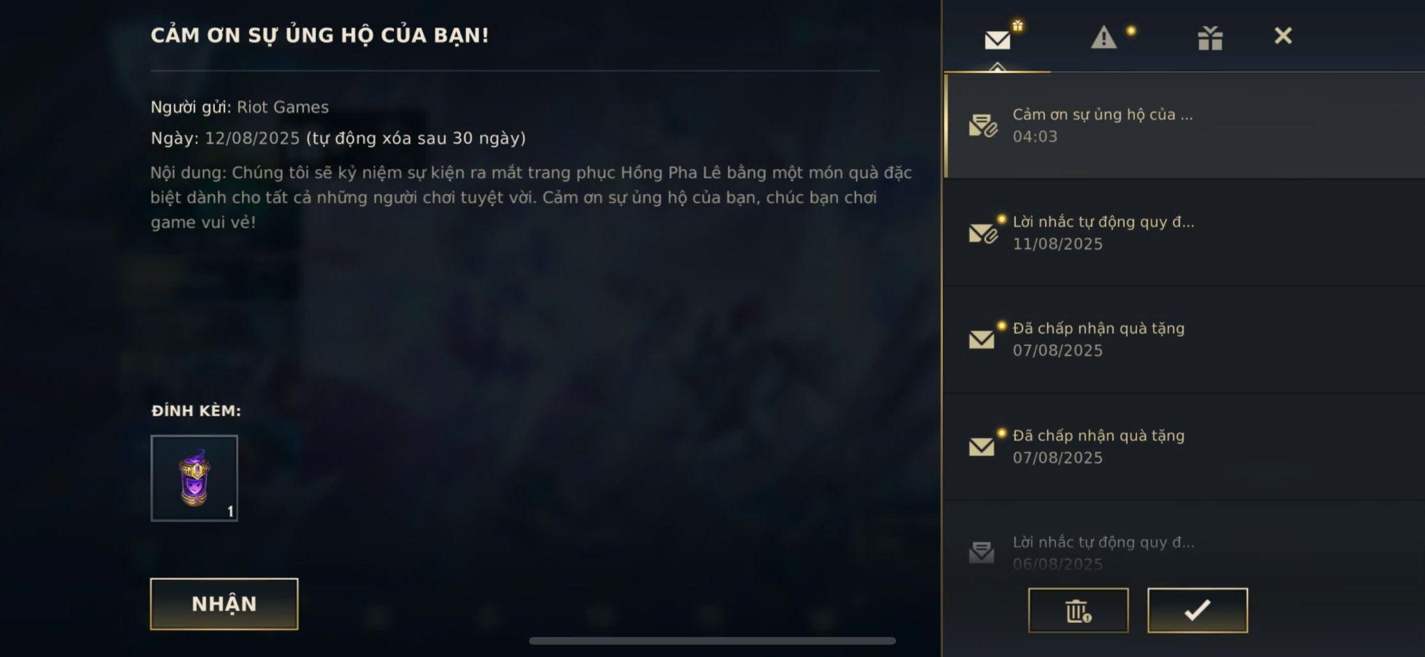 - Nếu chưa bấm nhận, thư tồn tại 30 ngày kể từ khi đăng nhập. Sau thời gian này thì mất quà.