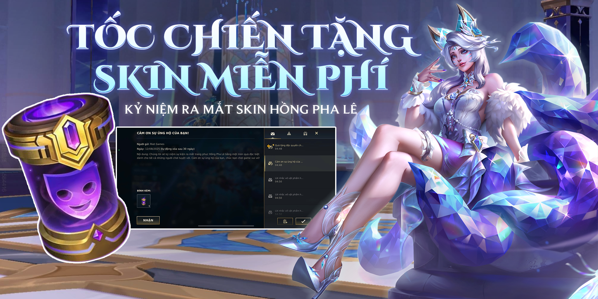 Nhân dịp bộ sưu tập Hồng Pha Lê – vũ trụ lấp lánh và sang trọng bậc nhất năm chính thức ra mắt, Tốc Chiến muốn gửi đến toàn thể game thủ một món quà vô cùng đặc biệt: Rương Skin Tím ngẫu nhiên hoàn toàn miễn phí.