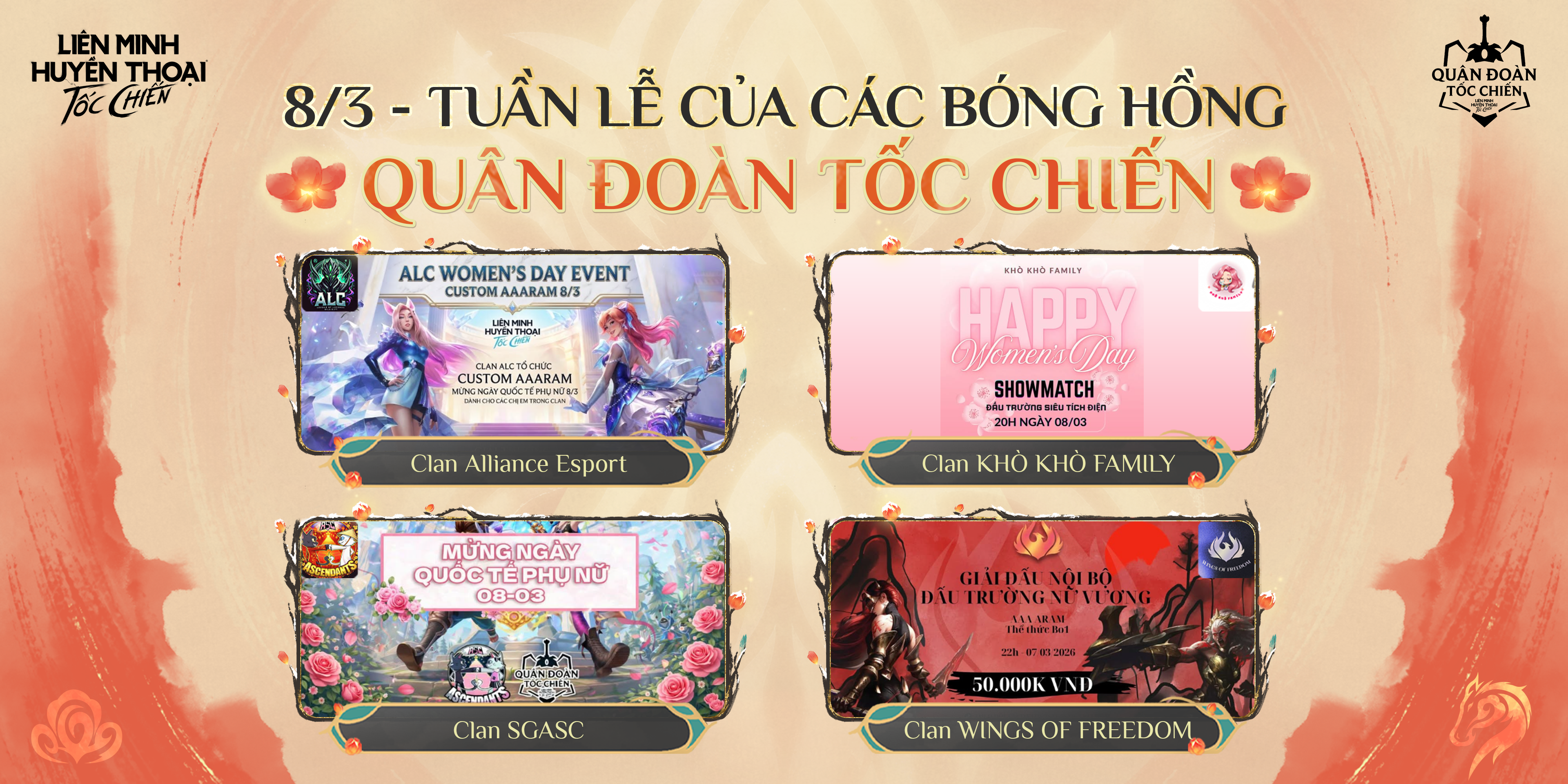 Trong không khí rộn ràng chào mừng Ngày Quốc tế Phụ nữ 08/03, Ban Điều Hành Quân Đoàn Tốc Chiến đã ghi nhận một tuần lễ hoạt động sôi nổi, nơi những “bóng hồng” của cộng đồng game thủ tỏa sáng với nhiều khoảnh khắc ấn tượng. Không chỉ là dịp tôn vinh phái đẹp, sự kiện còn tạo cơ hội để các Clan tăng cường kết nối, giao lưu và tích lũy thêm những điểm số quan trọng cho Bảng Xếp Hạng Quân Đoàn tháng 3.