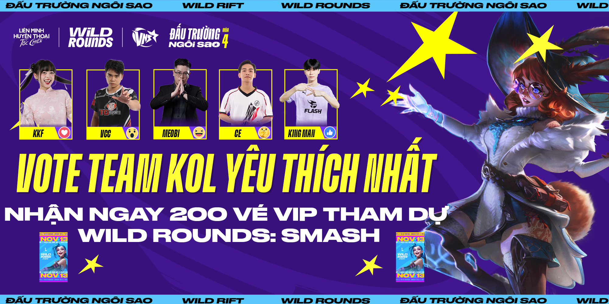 Năm nay, nhánh KOL quy tụ dàn tuyển thủ, streamer và creator đình đám, cùng những gương mặt trẻ đầy triển vọng. Hãy nhanh tay “trao tim” cho đội bạn yêu thích nhất và cùng cổ vũ họ chinh phục WILD ROUNDS: SMASH 2025!
