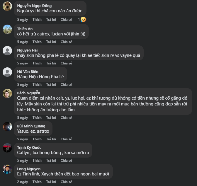 - "Trong đống này Miss, Yasuo, Lux, Ezreal, Lucian hiện tại đang là 5 skin có hiệu ứng đẹp nhất, nhìn sang hẳn"