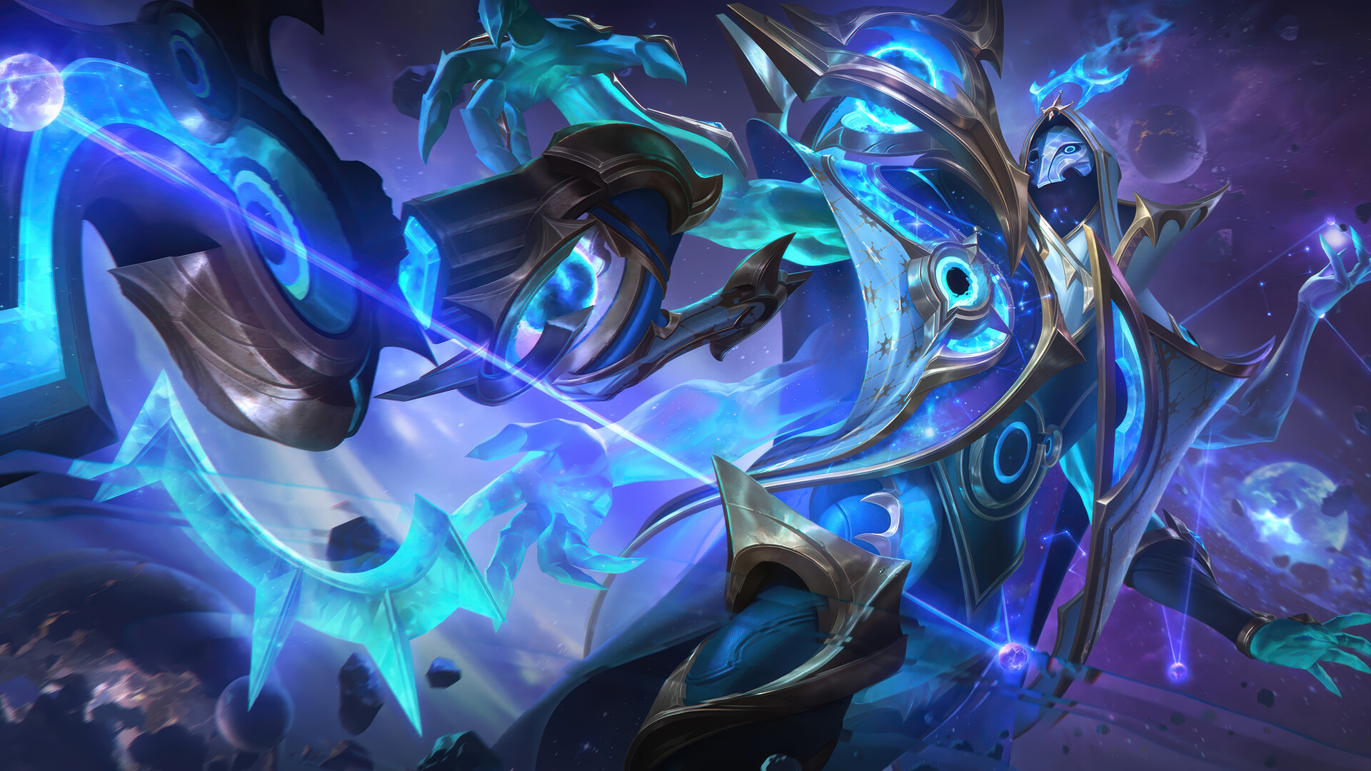 Jhin xuất hiện với diện mạo huyền bí lấy cảm hứng từ các chòm sao và không gian vũ trụ. Trang phục này được đánh giá cao nhờ thiết kế vũ khí tinh xảo cùng hiệu ứng chiêu cuối “Sân Khấu Tử Thần” mang đậm tính nghệ thuật.