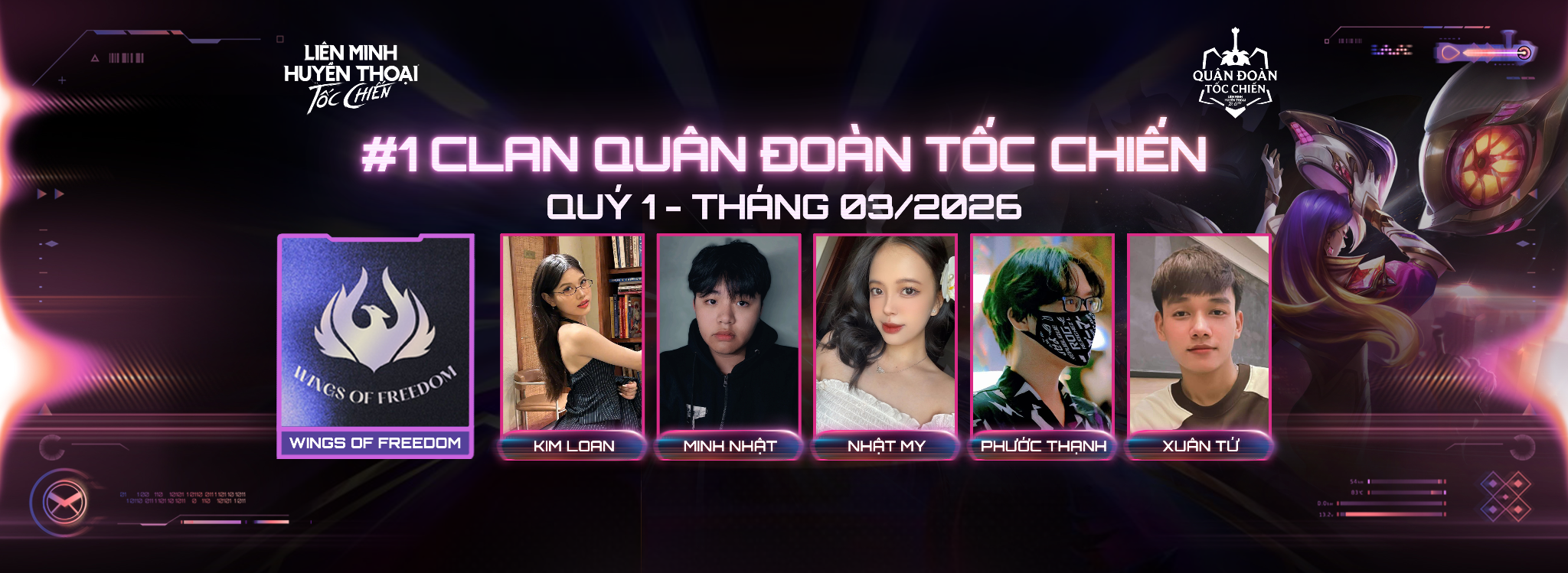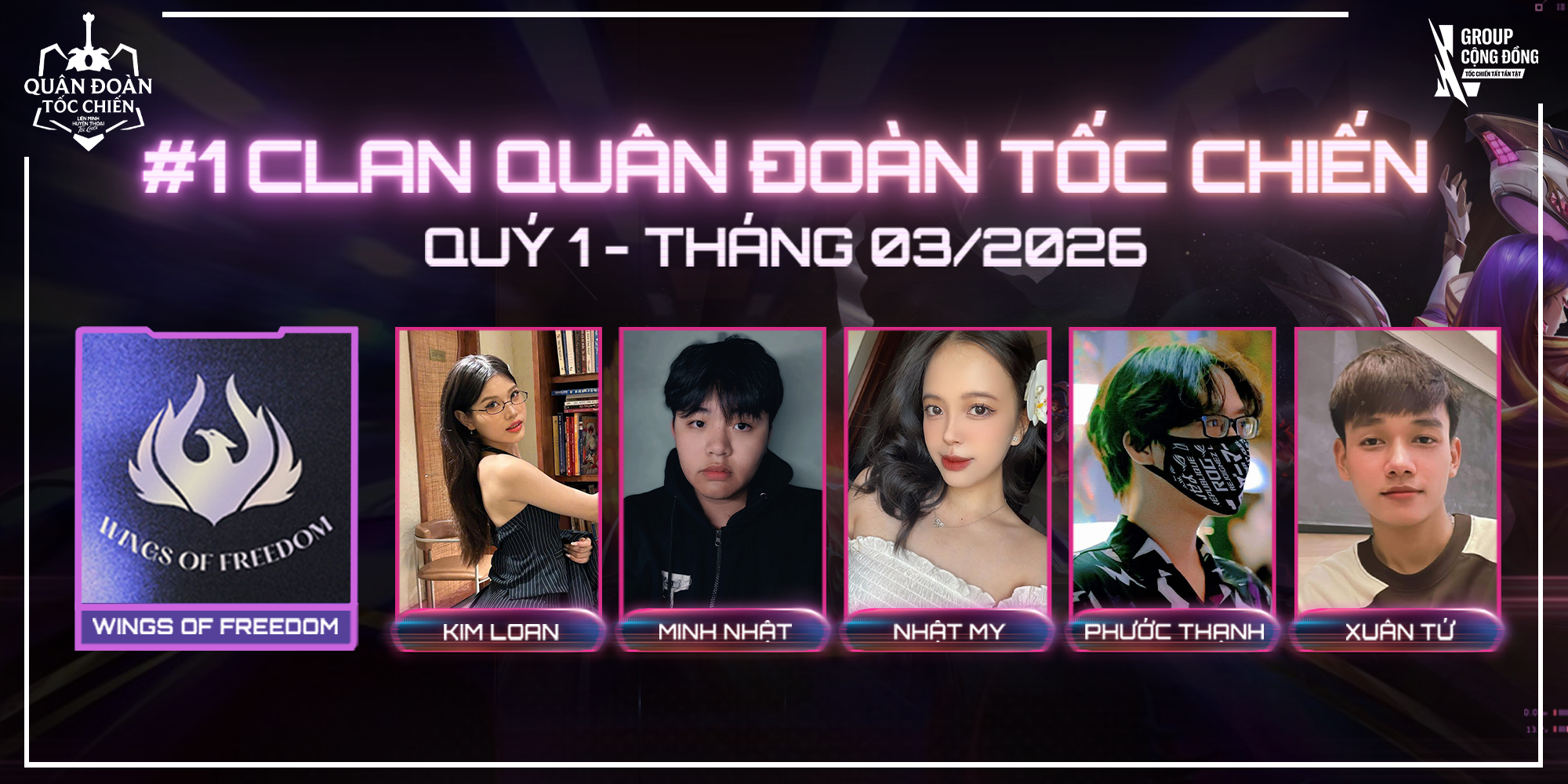 Đằng sau hào quang của Clan WINGS OF FREEDOM là những gương mặt tiêu biểu đã cống hiến trọn vẹn vì màu cờ sắc áo. BTC xin trân trọng vinh danh các thành viên - những đại diện đã góp phần làm nên niềm tự hào và sức mạnh của nhà vô địch: