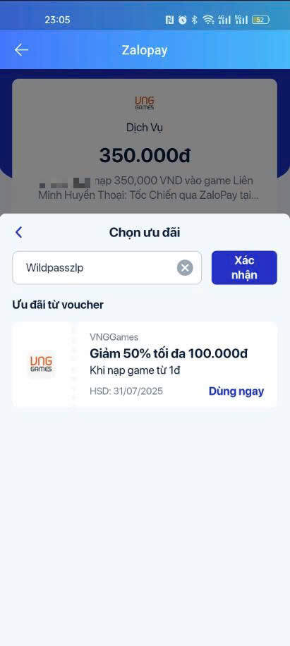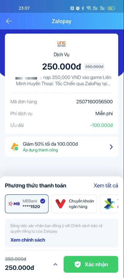 - GÓI TÂN BINH: Lần đầu nạp game bằng ZaloPay? Nhận ngay ưu đãi giảm 50%, tối đa 100.000đ.