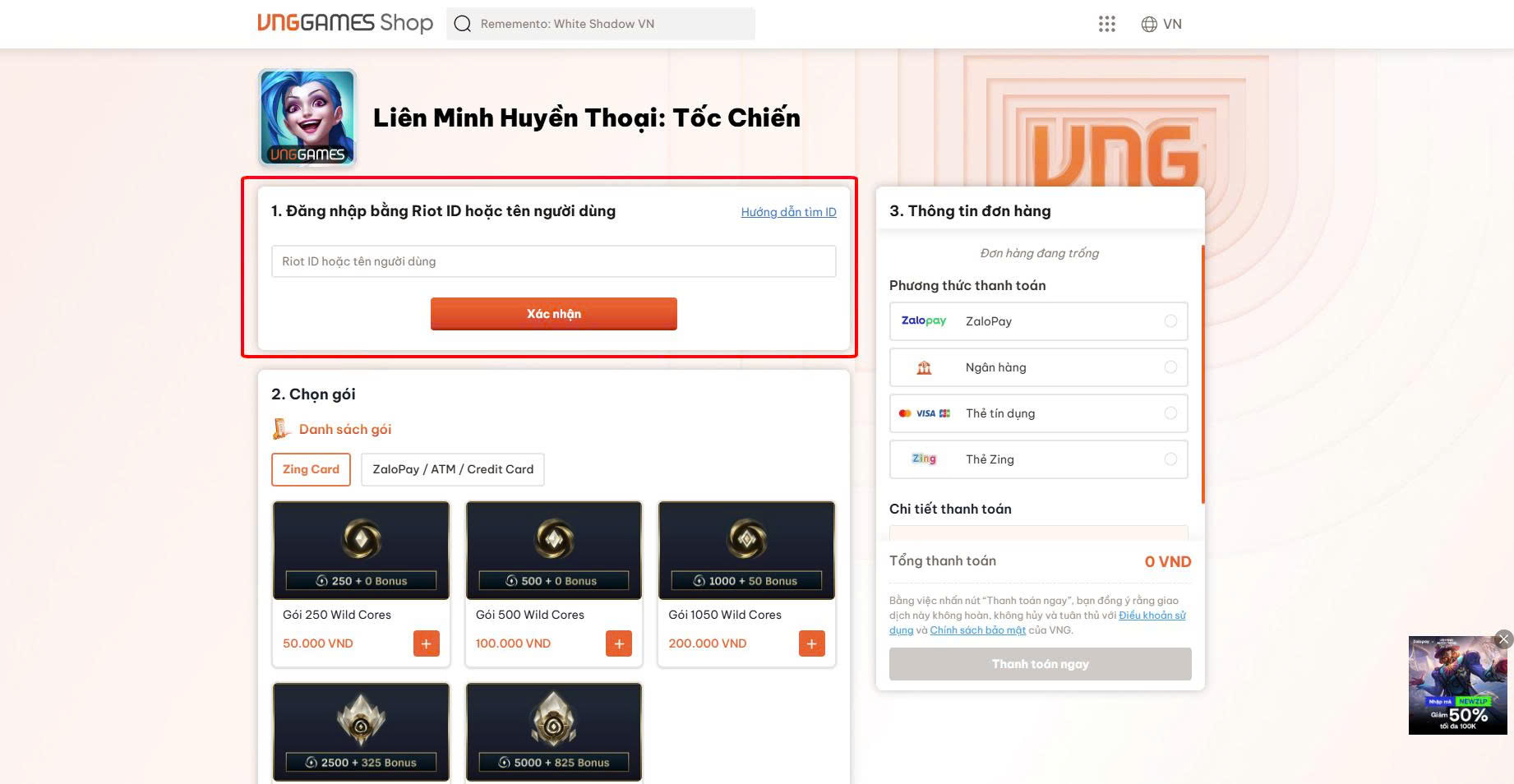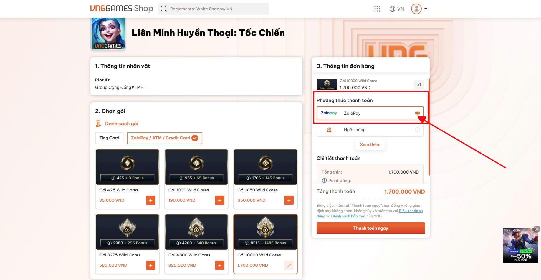 2. Bước 2: Chọn gói Wild Cores mong muốn và phương thức thanh toán là ZaloPay.
