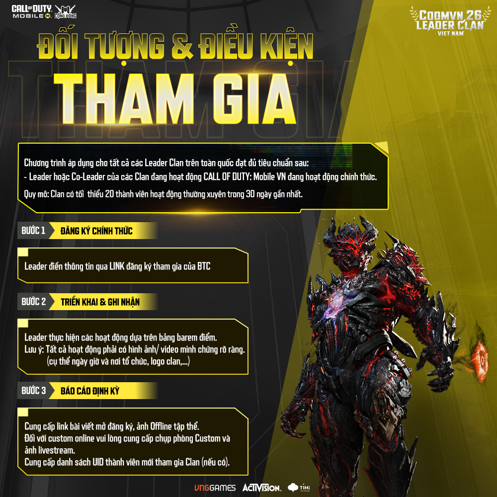 Chương trình được triển khai trên phạm vi toàn quốc, áp dụng cho các Leader Clan đang hoạt động chính thức tại Call of Duty: Mobile Việt Nam, với các điều kiện cơ bản sau:
