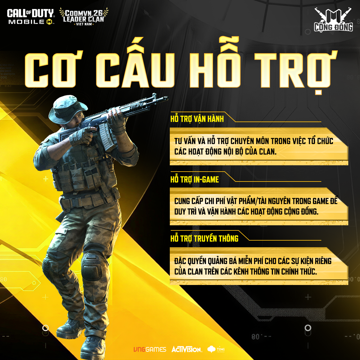 Ưu tiên quảng bá miễn phí các hoạt động riêng của Clan như giải đấu nội bộ, offline, chuỗi sự kiện đặc biệt trên các kênh truyền thông chính thức của Call of Duty: Mobile Việt Nam và cộng đồng CODM.