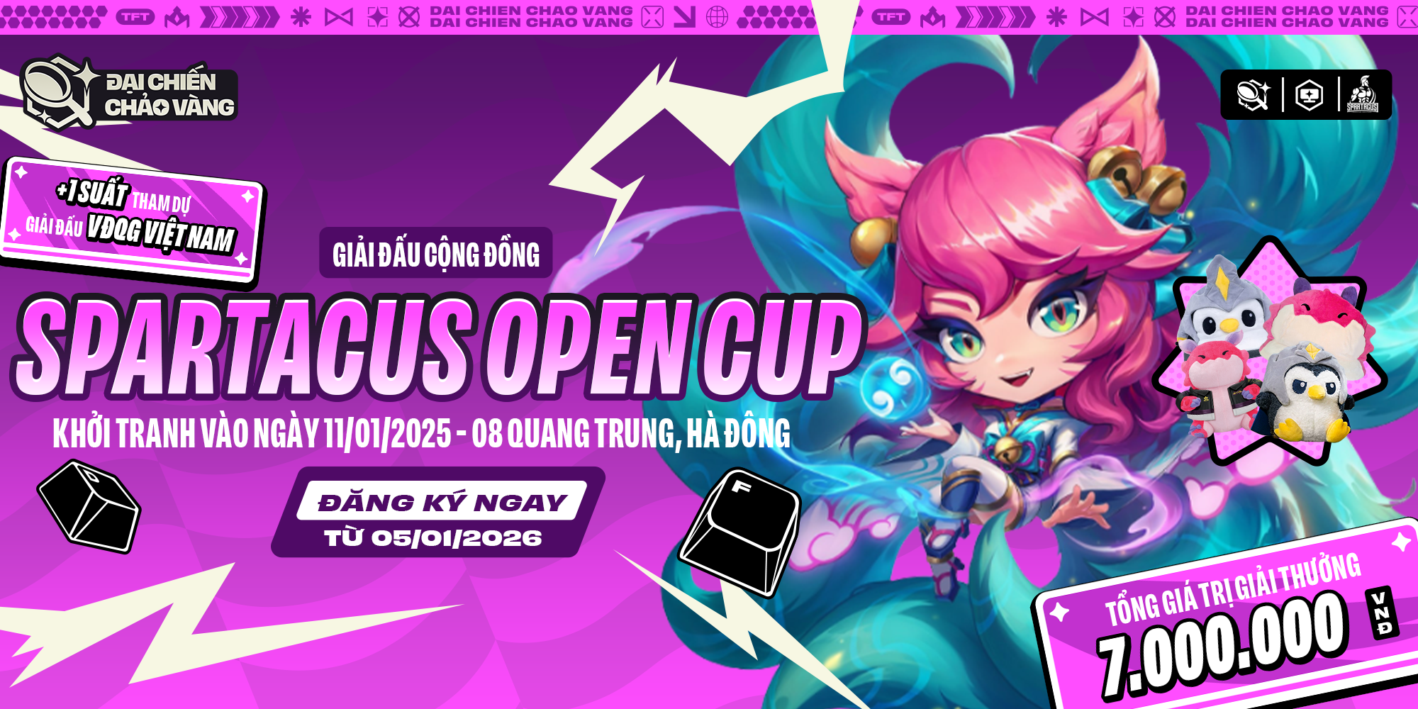 Bước sang năm mới, bàn cờ nhân phẩm lại tiếp tục rực lửa! Spartacus Cyber Open Cup TFT chính thức trở lại tại cơ sở Quang Trung, hứa hẹn mang đến những round đấu căng não, những pha xoay bài đầy bản lĩnh và loạt khoảnh khắc bùng nổ cảm xúc.